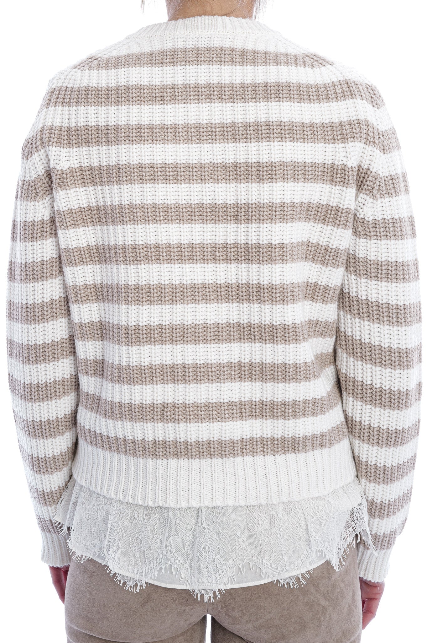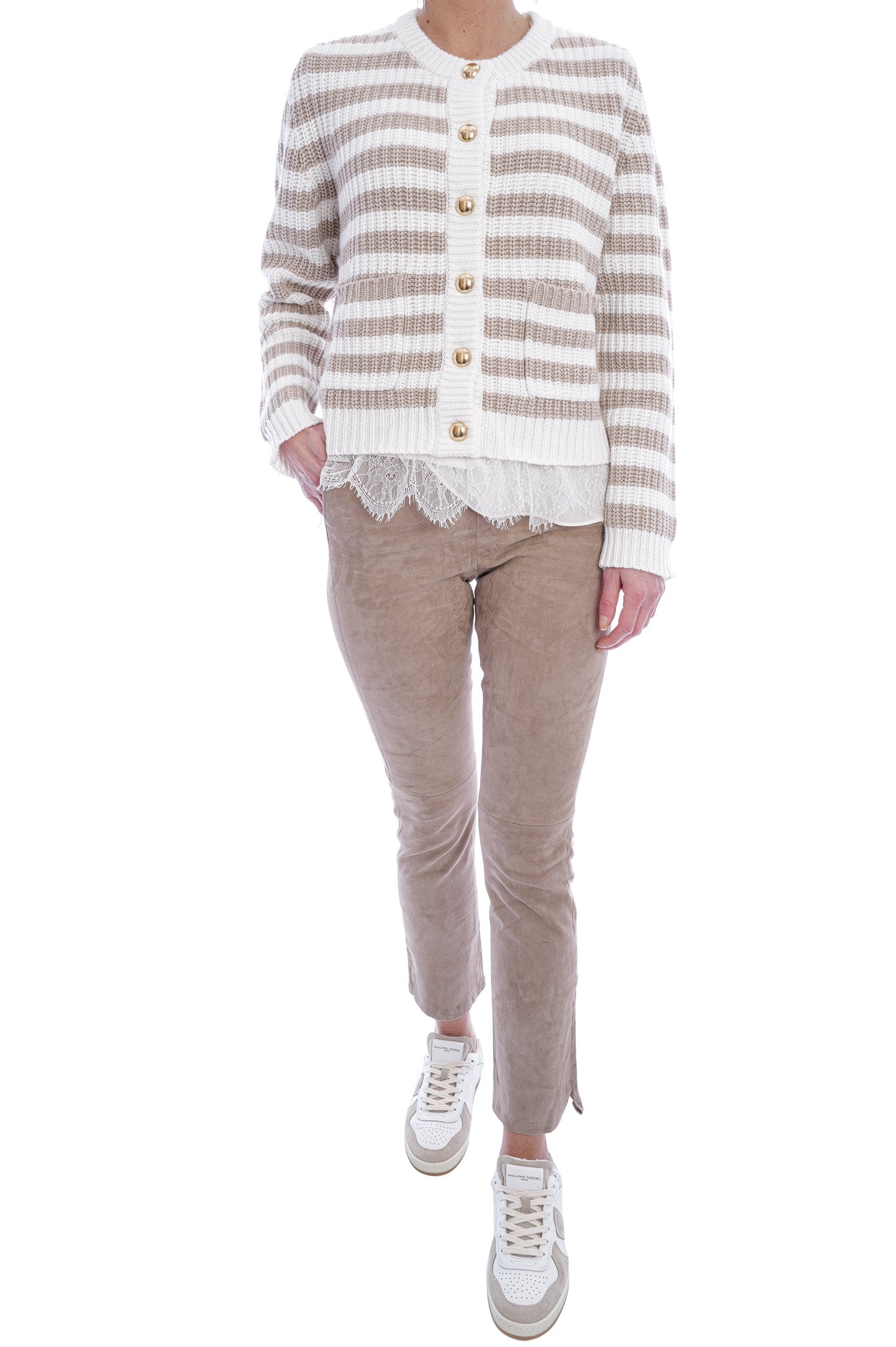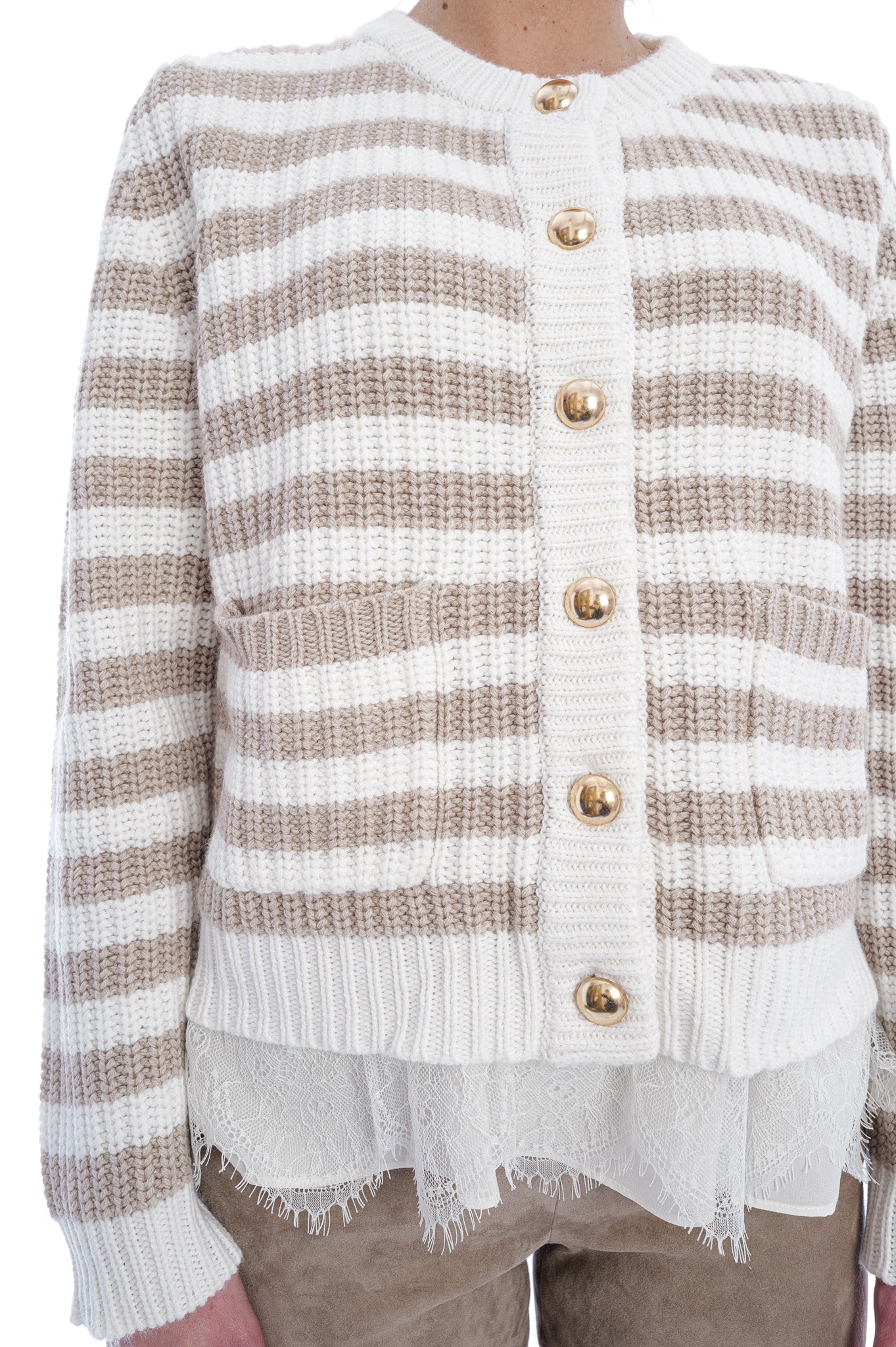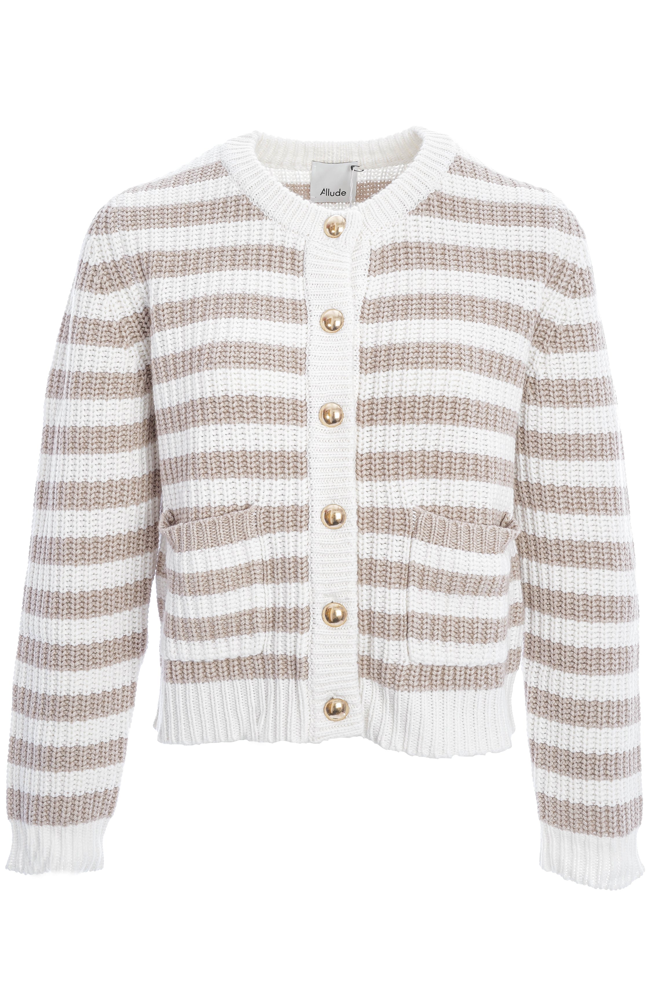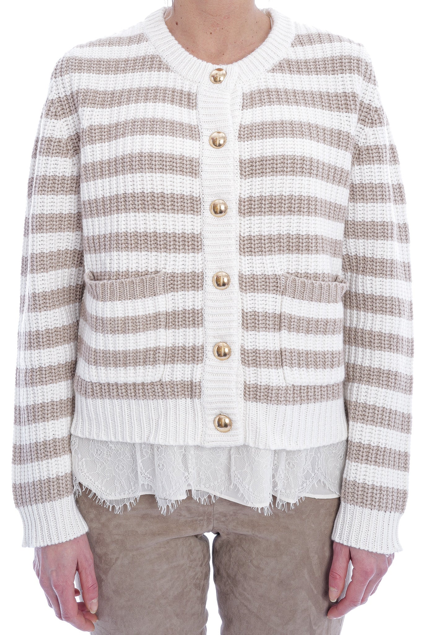 Diese gestrickte Strickjacke überzeugt mit zeitlosen Streifen in Creme und Beige sowie edlen, goldfarbenen Knöpfen. Der klassische Rundhalsausschnitt und die aufgesetzten Taschen machen sie zu einem vielseitigen Lieblingsstück für elegante und lässige Looks.