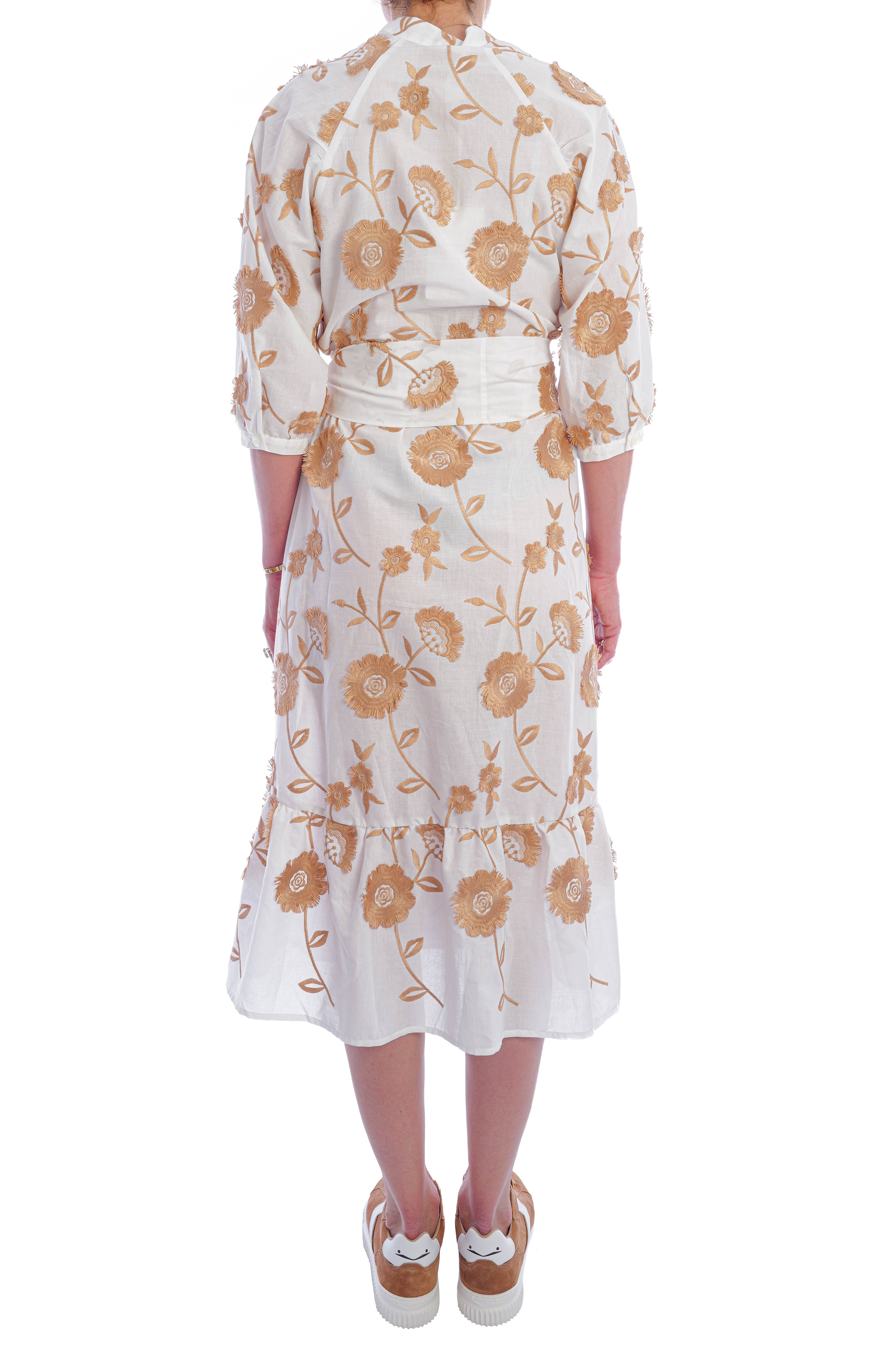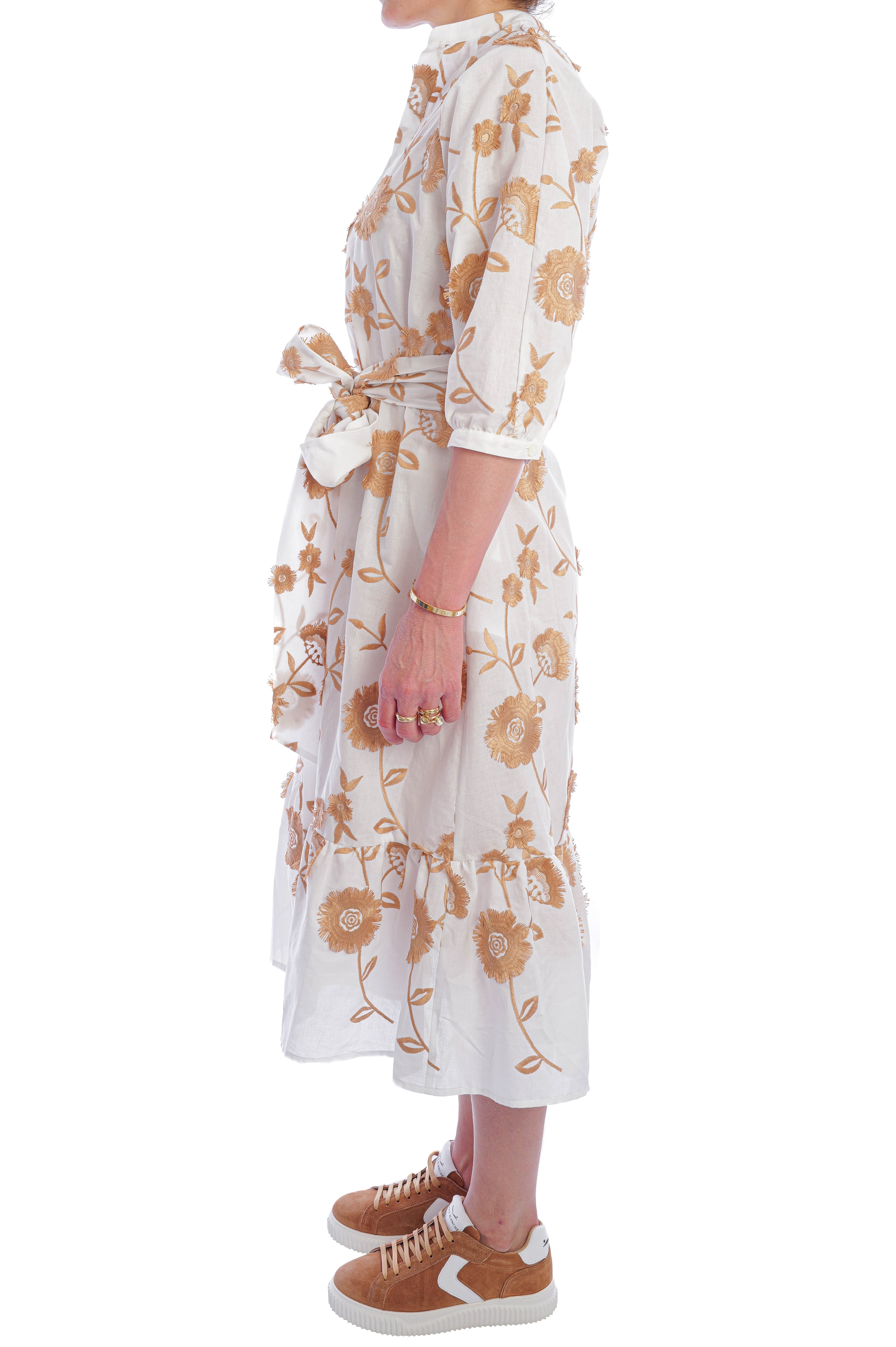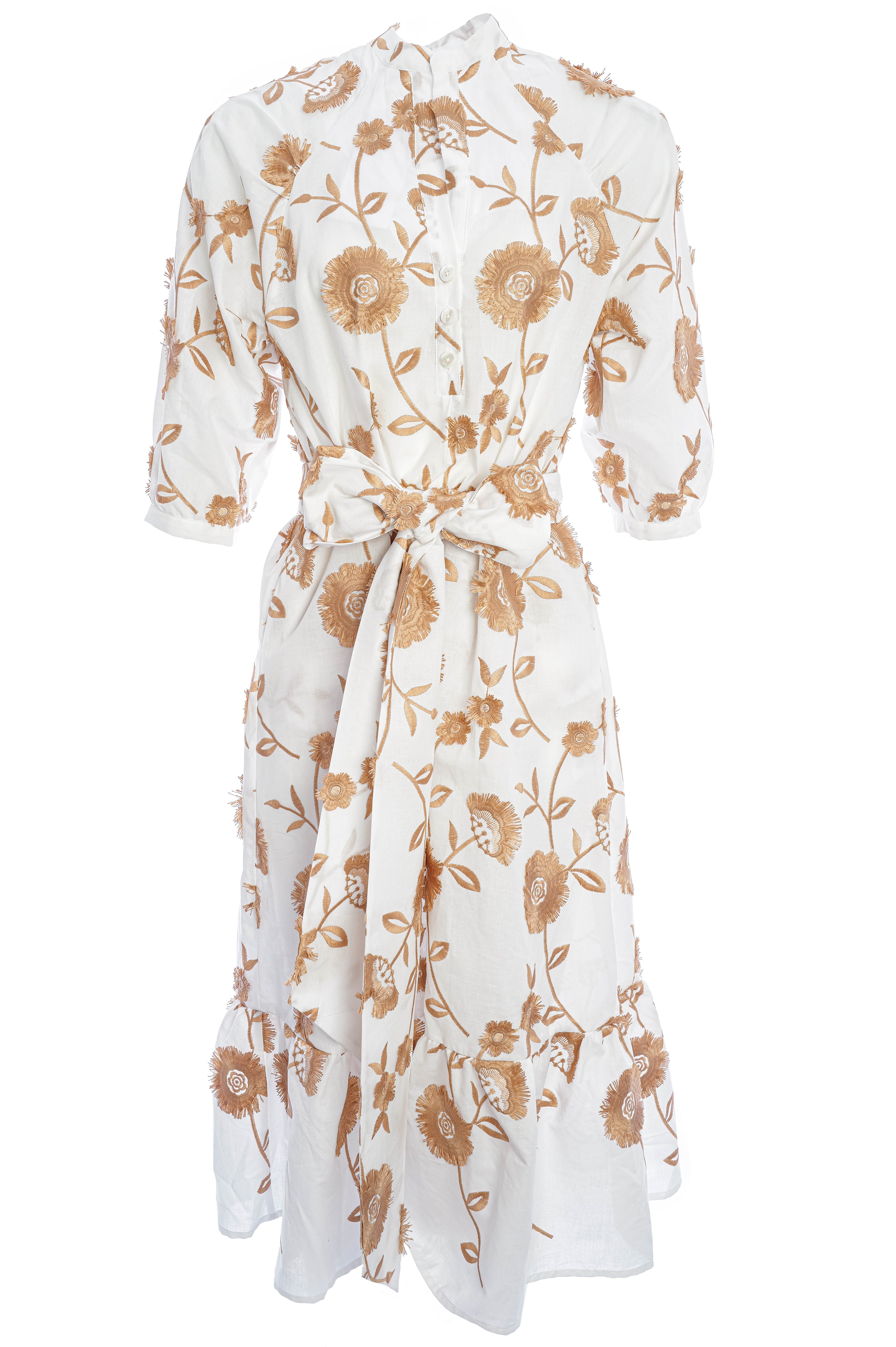 Dieses elegante Midikleid in Cremeweiß mit warmem, floralem Print begeistert durch seine feminine Silhouette mit Bindegürtel, dezentem Stehkragen und locker fallenden Ärmeln. Der fließende Stoff und der romantische Volantsaum verleihen dem Kleid eine luxuriöse Leichtigkeit – perfektes Sommerkleid für besondere Anlässe und stilvolle Alltagslooks, Damen Midikleid, florales Kleid, hochwertig, feminin, Boho Chic, festlich, zeitlos elegant.