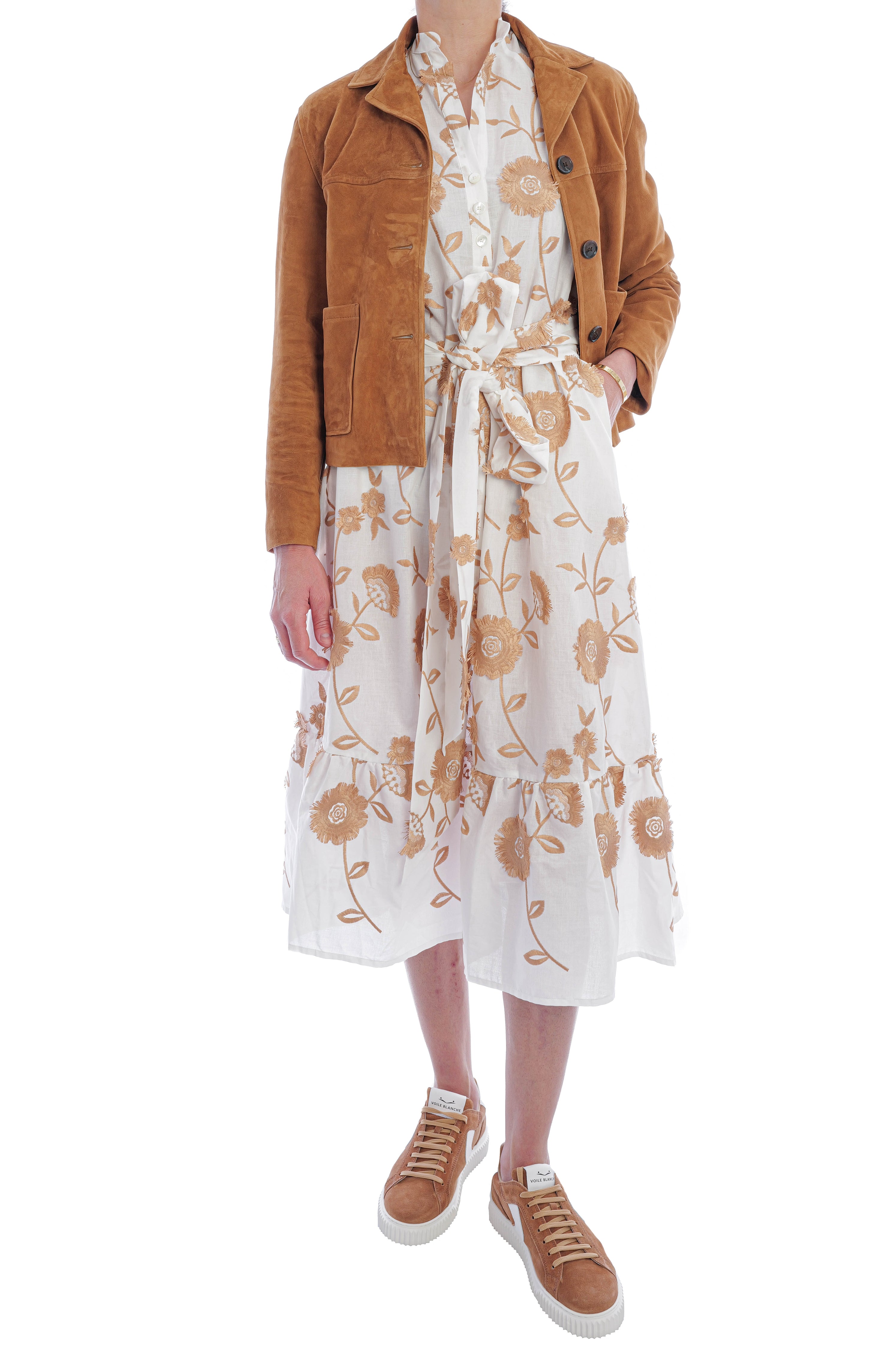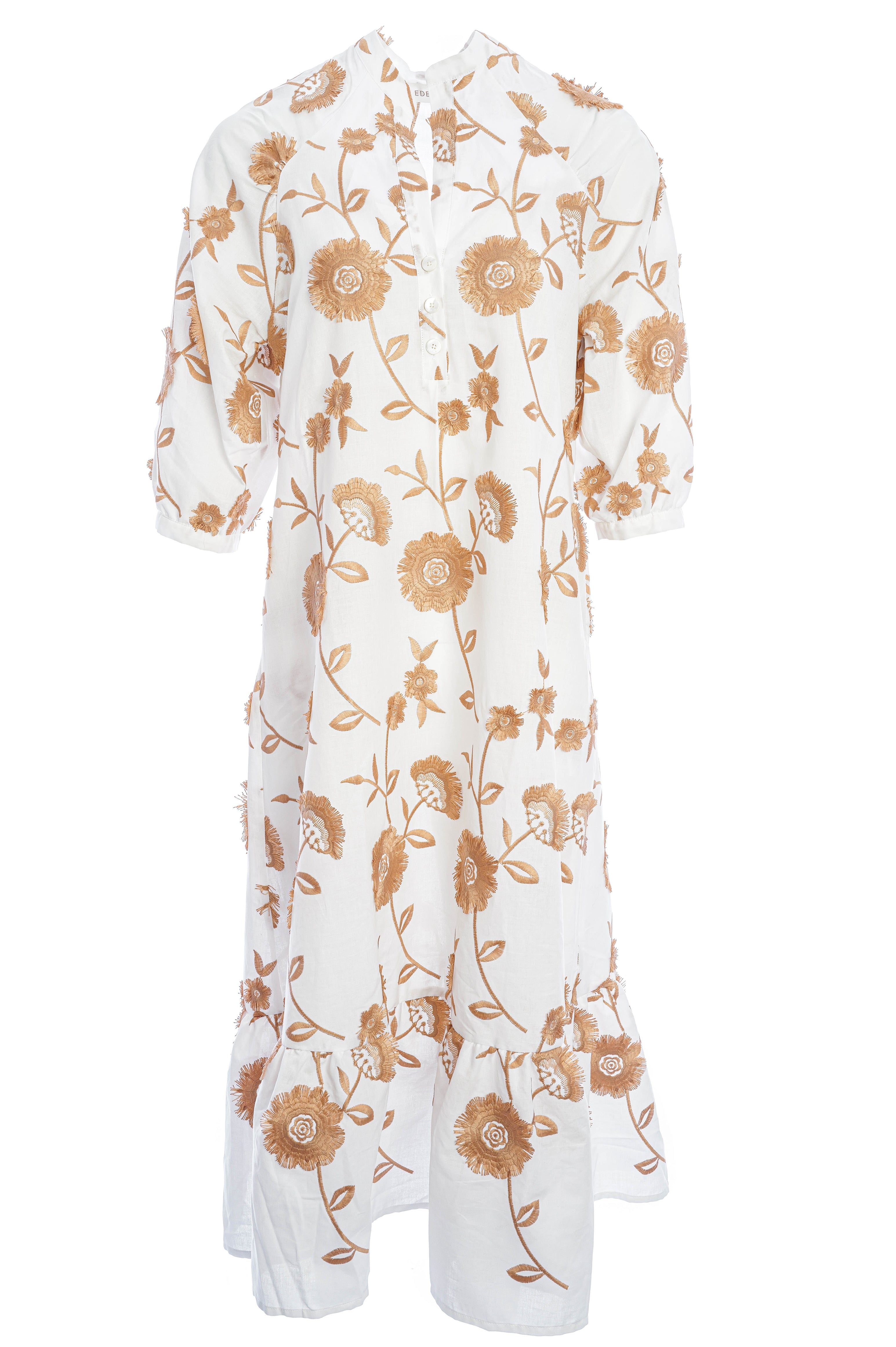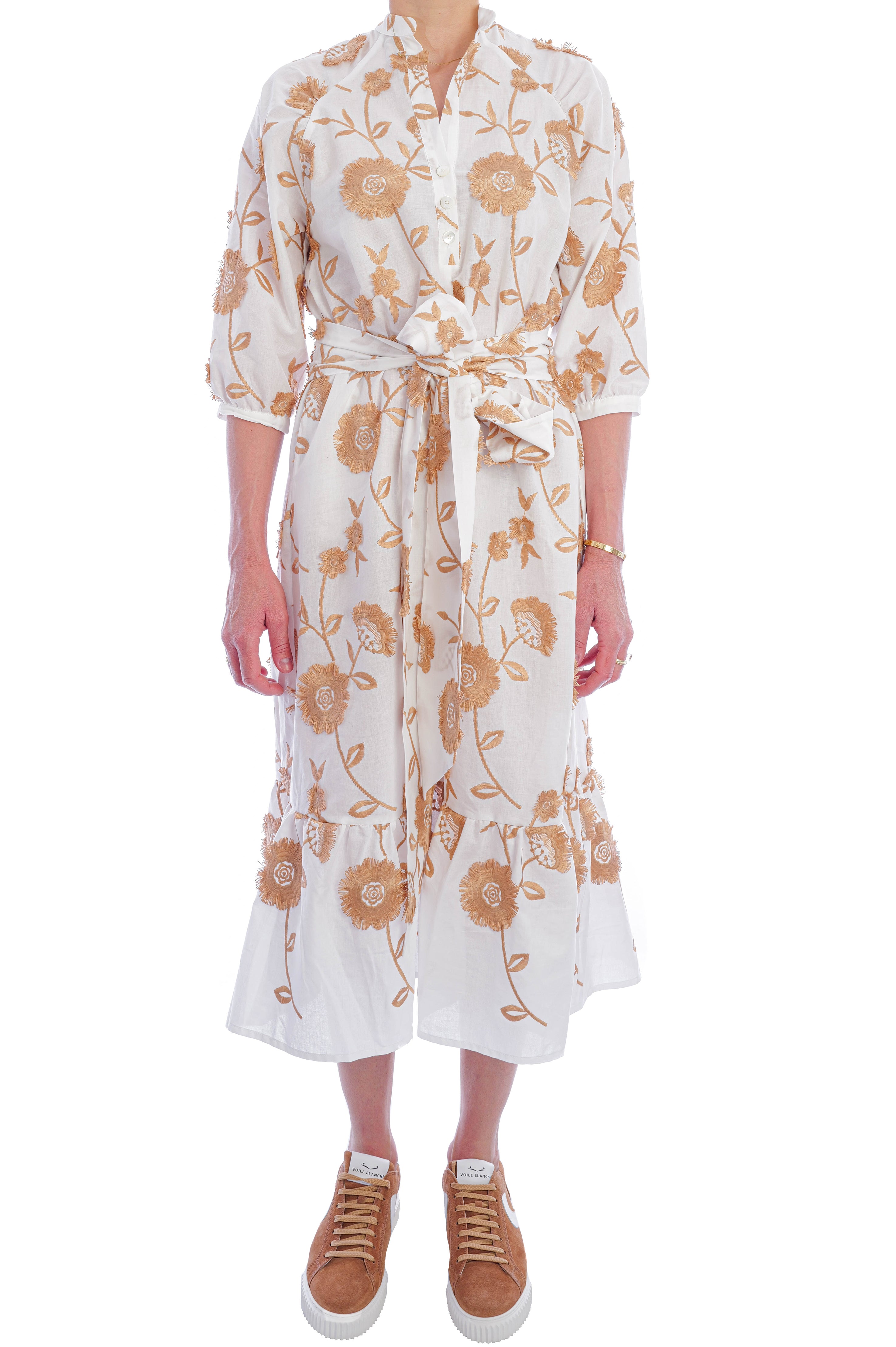 Dieses elegante Midikleid in Cremeweiß mit warmem, floralem Print begeistert durch seine feminine Silhouette mit Bindegürtel, dezentem Stehkragen und locker fallenden Ärmeln. Der fließende Stoff und der romantische Volantsaum verleihen dem Kleid eine luxuriöse Leichtigkeit – perfektes Sommerkleid für besondere Anlässe und stilvolle Alltagslooks, Damen Midikleid, florales Kleid, hochwertig, feminin, Boho Chic, festlich, zeitlos elegant.