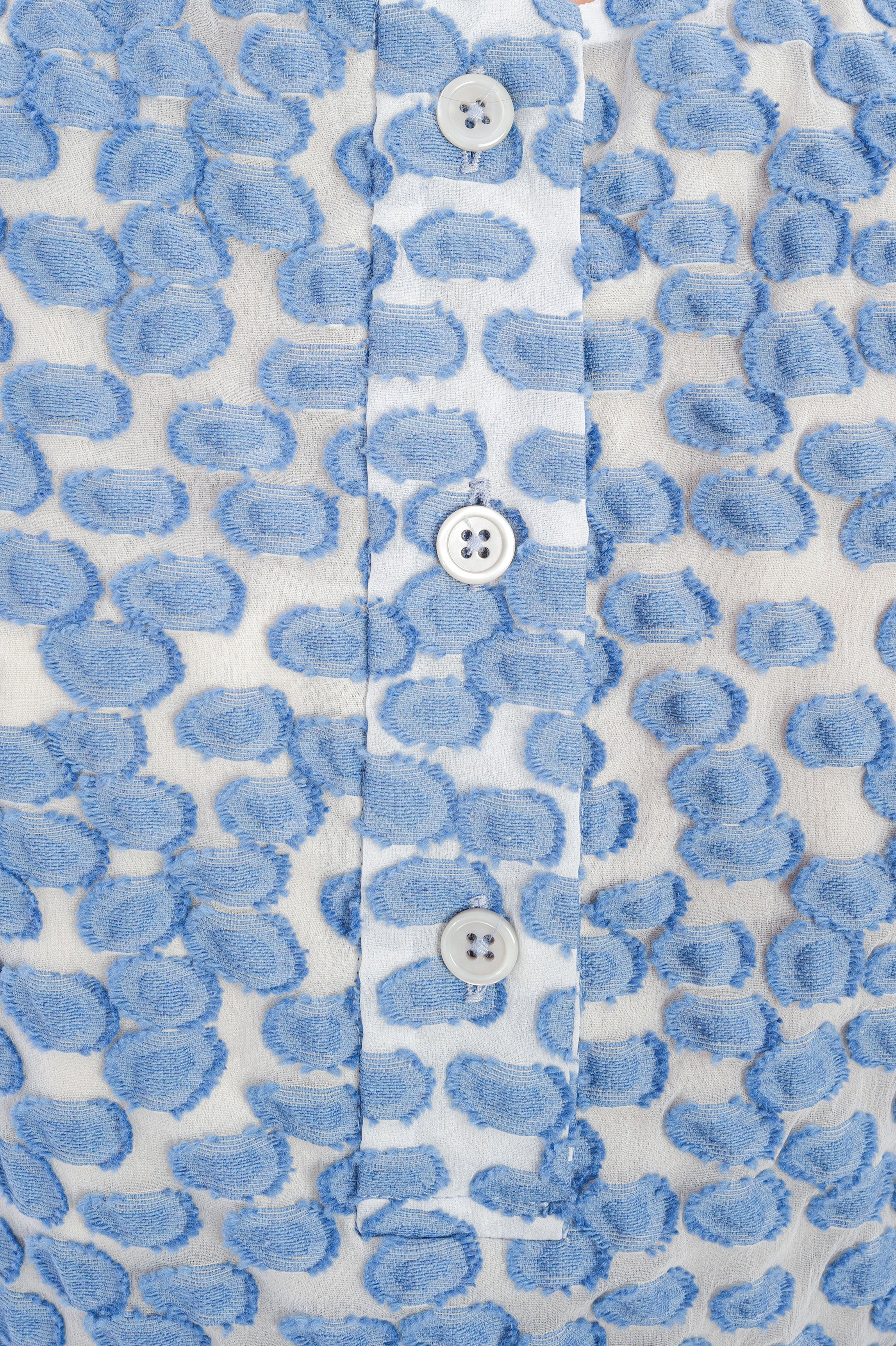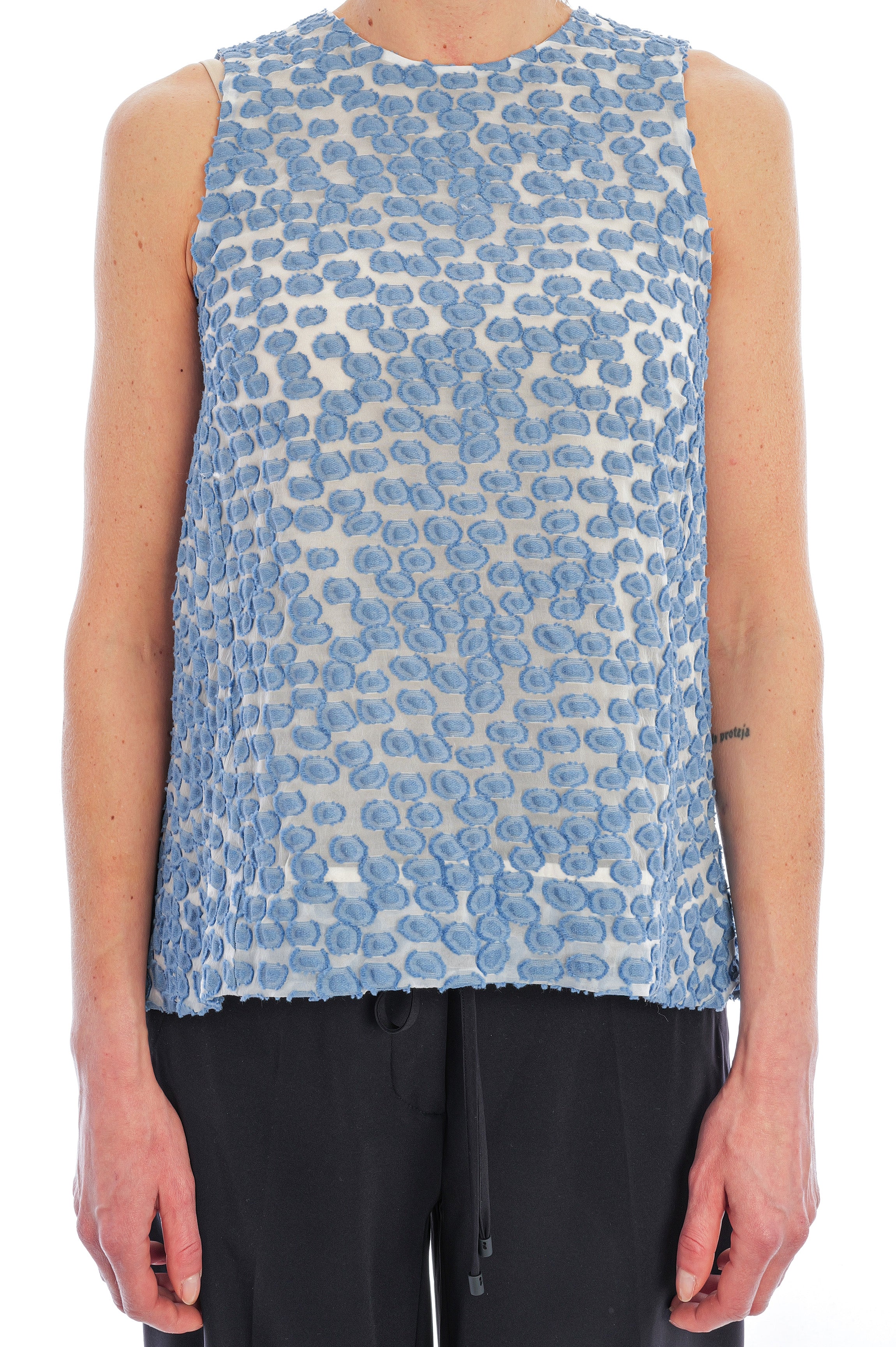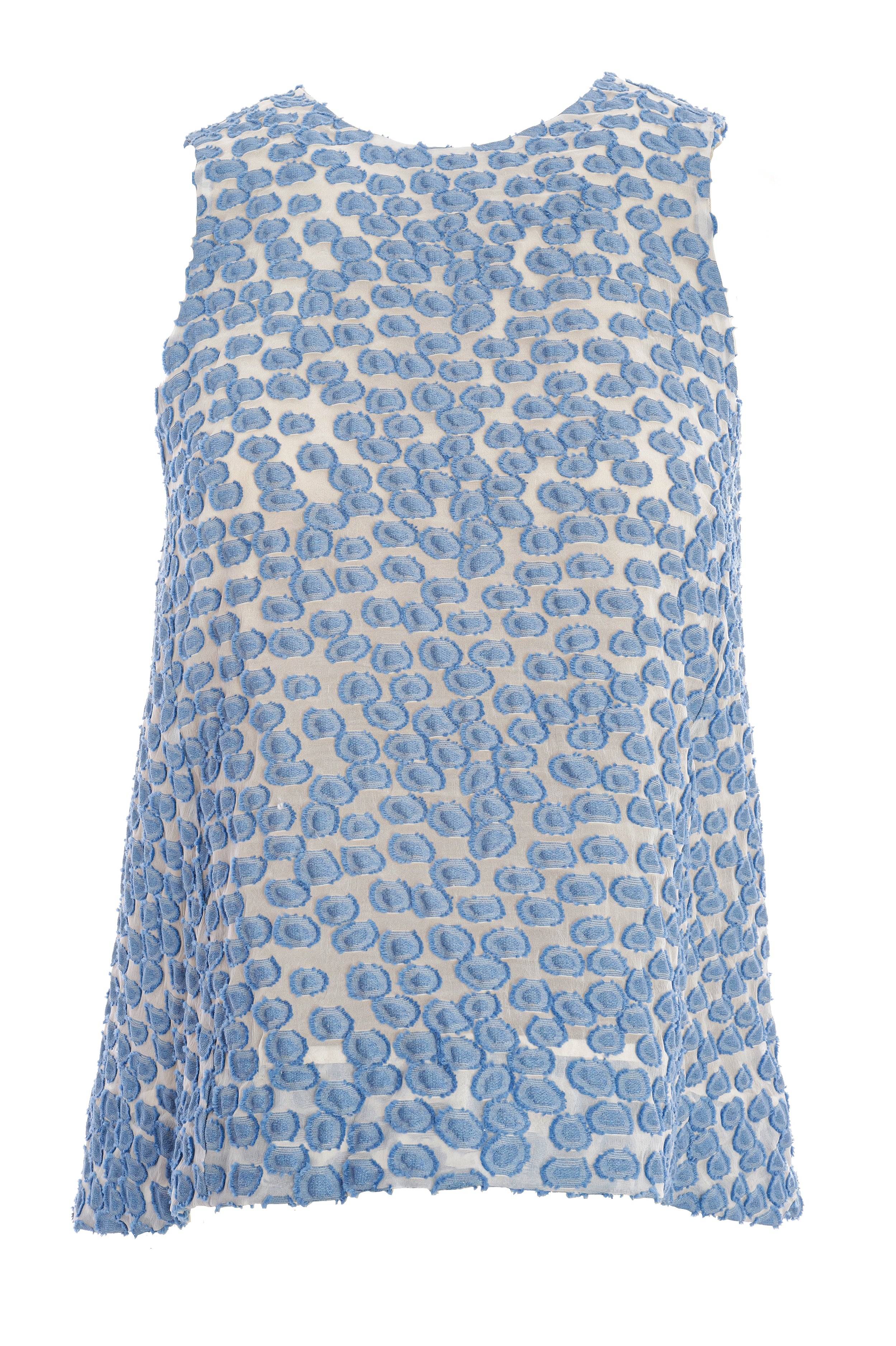 Das Top von Odeeh besticht durch seine luftige, leicht ausgestellte Silhouette und das elegante Allover-Muster in zartem Blau auf hellem Grund. Gefertigt aus einem besonders hochwertigen, strukturierten Material mit feiner, plastischer Oberfläche wirkt das Modell edel und sorgt zugleich für ein angenehm leichtes Tragegefühl.