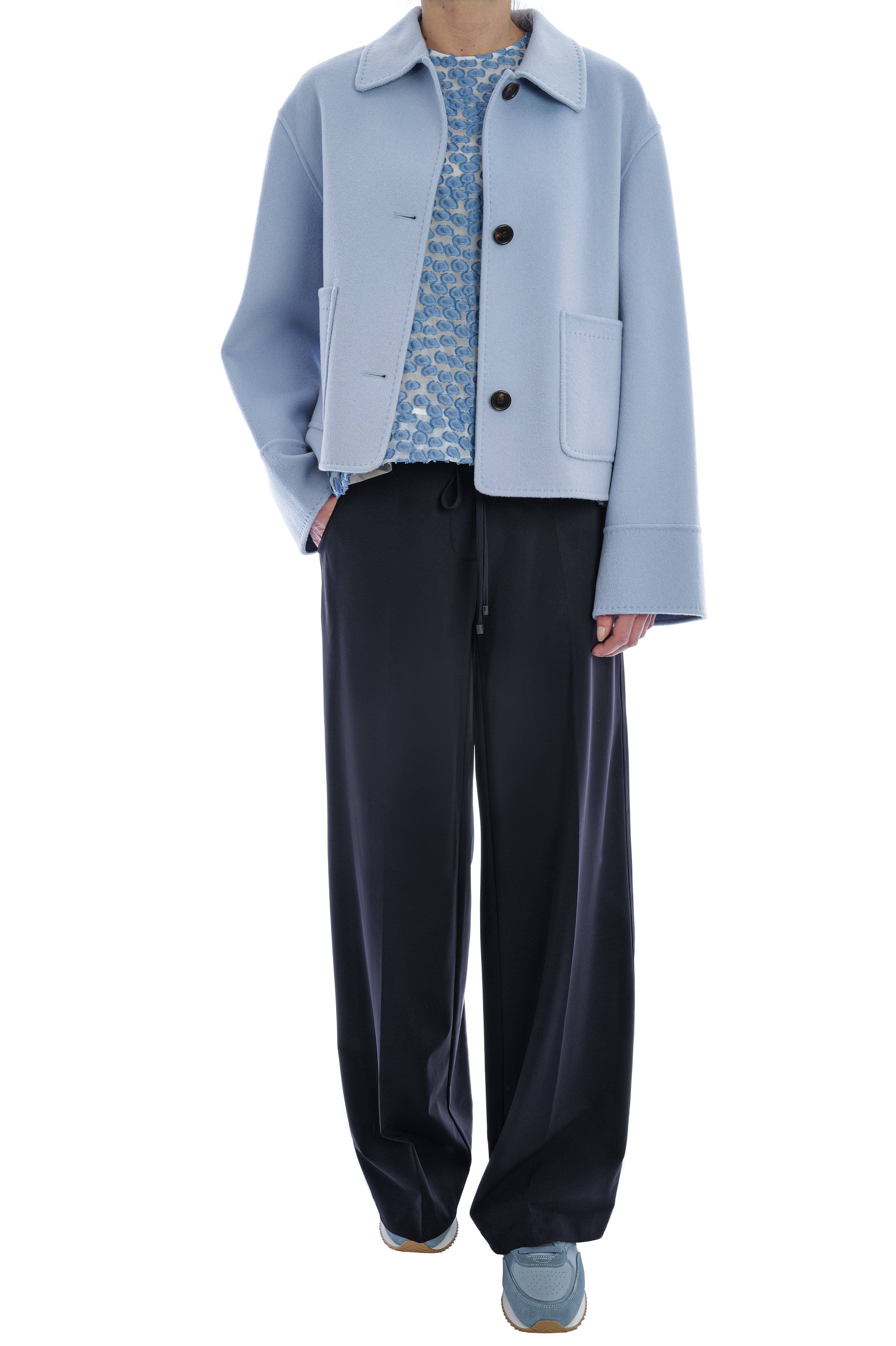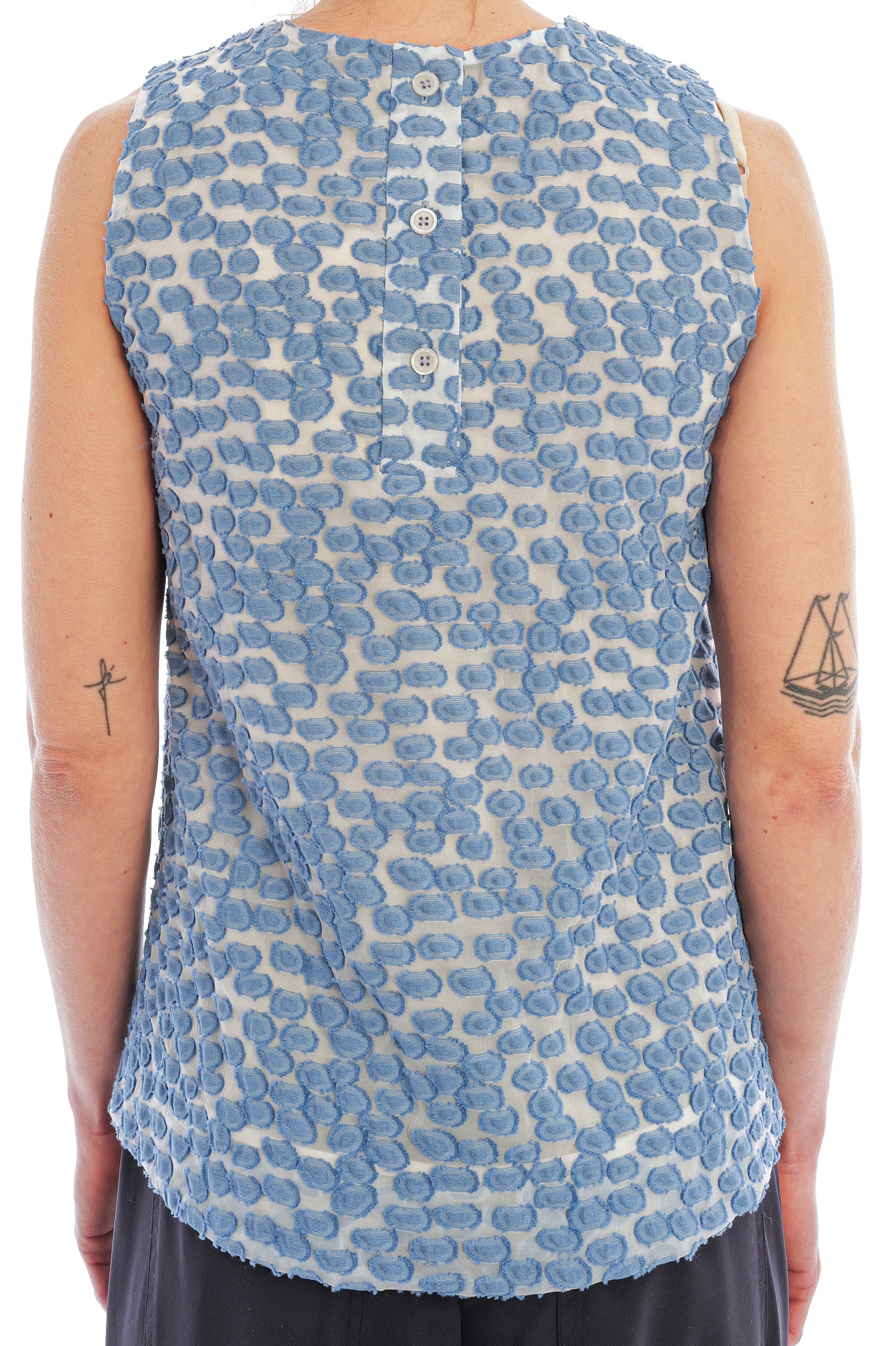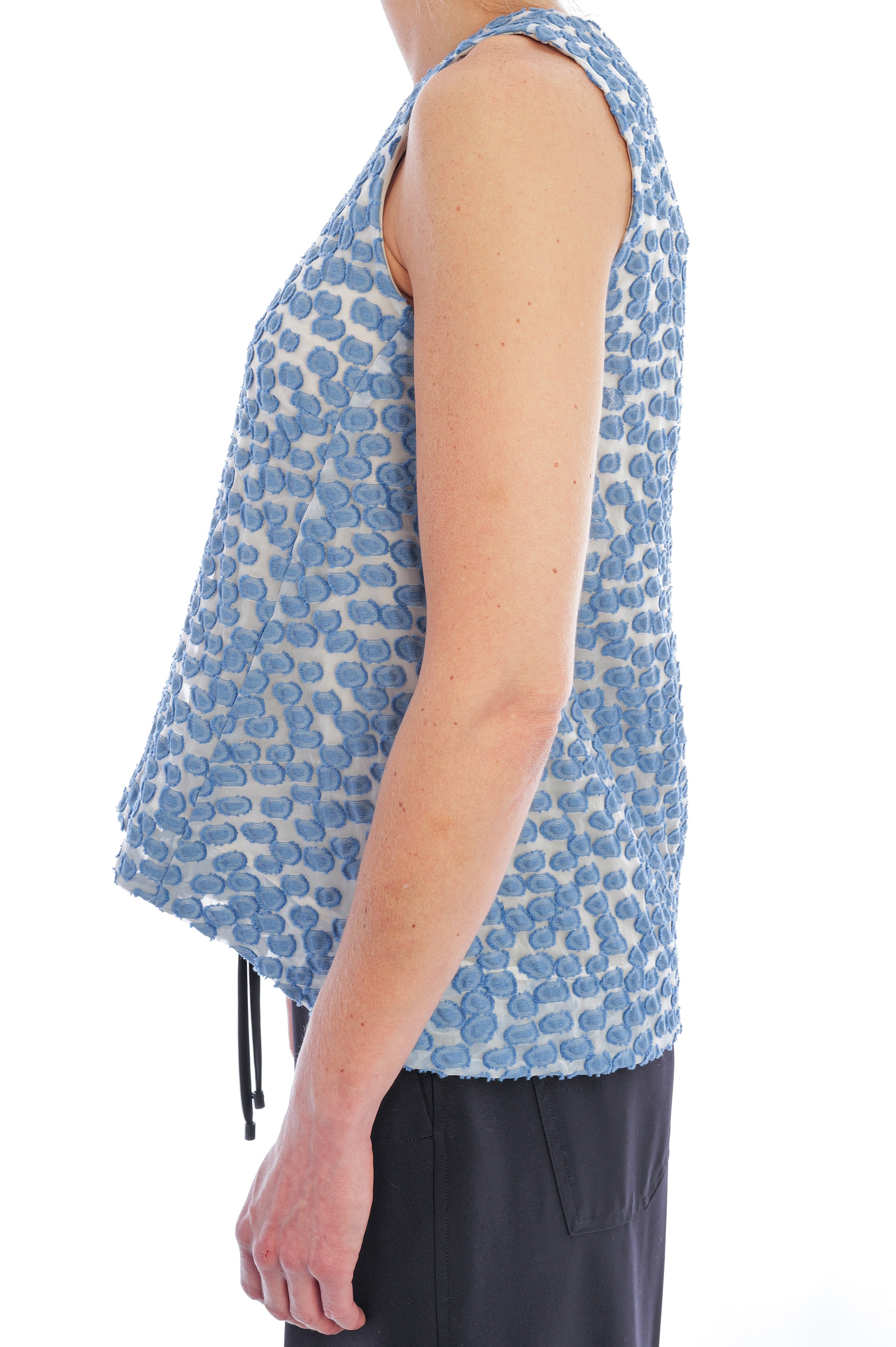 Das Top von Odeeh besticht durch seine luftige, leicht ausgestellte Silhouette und das elegante Allover-Muster in zartem Blau auf hellem Grund. Gefertigt aus einem besonders hochwertigen, strukturierten Material mit feiner, plastischer Oberfläche wirkt das Modell edel und sorgt zugleich für ein angenehm leichtes Tragegefühl.