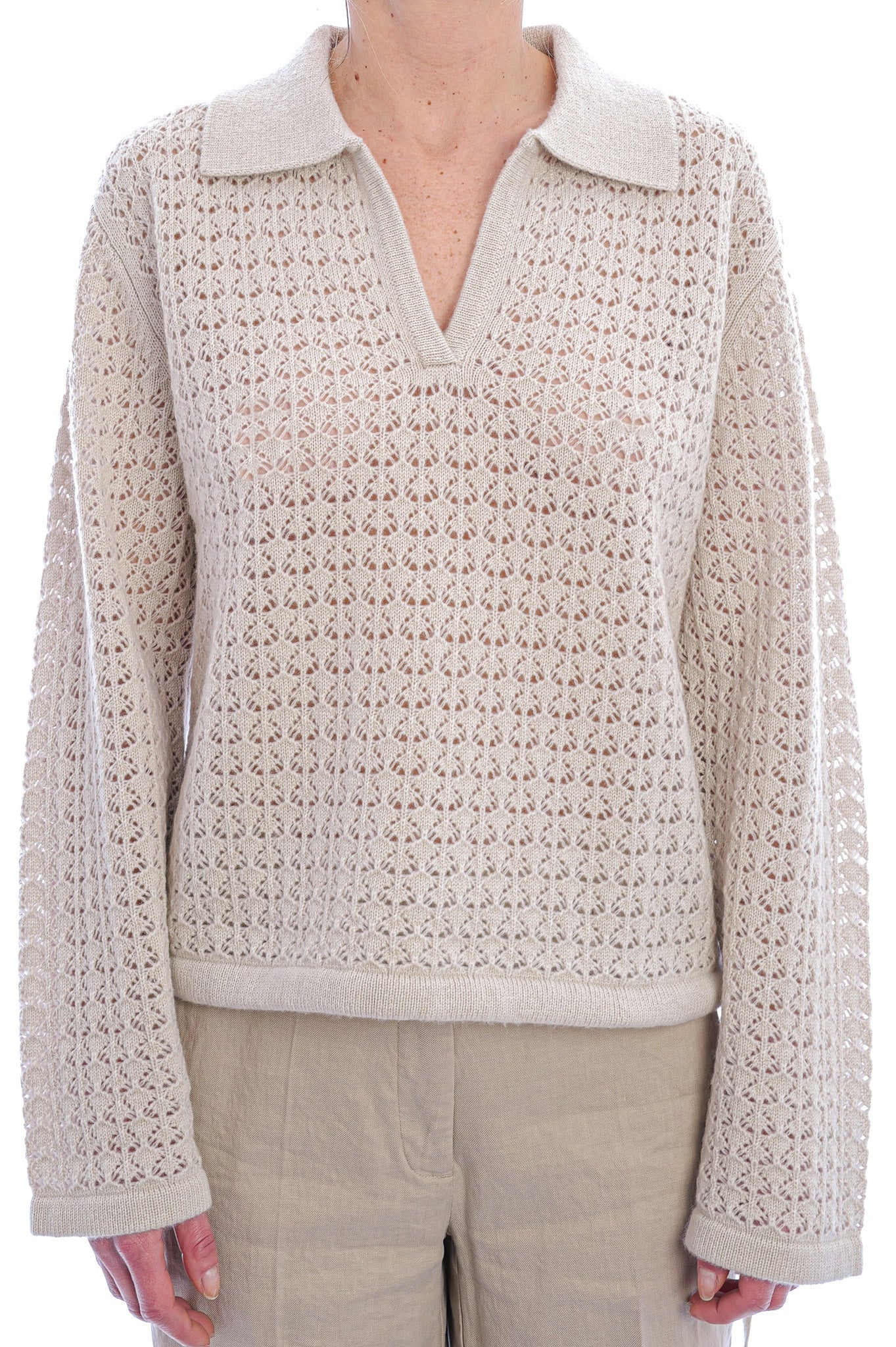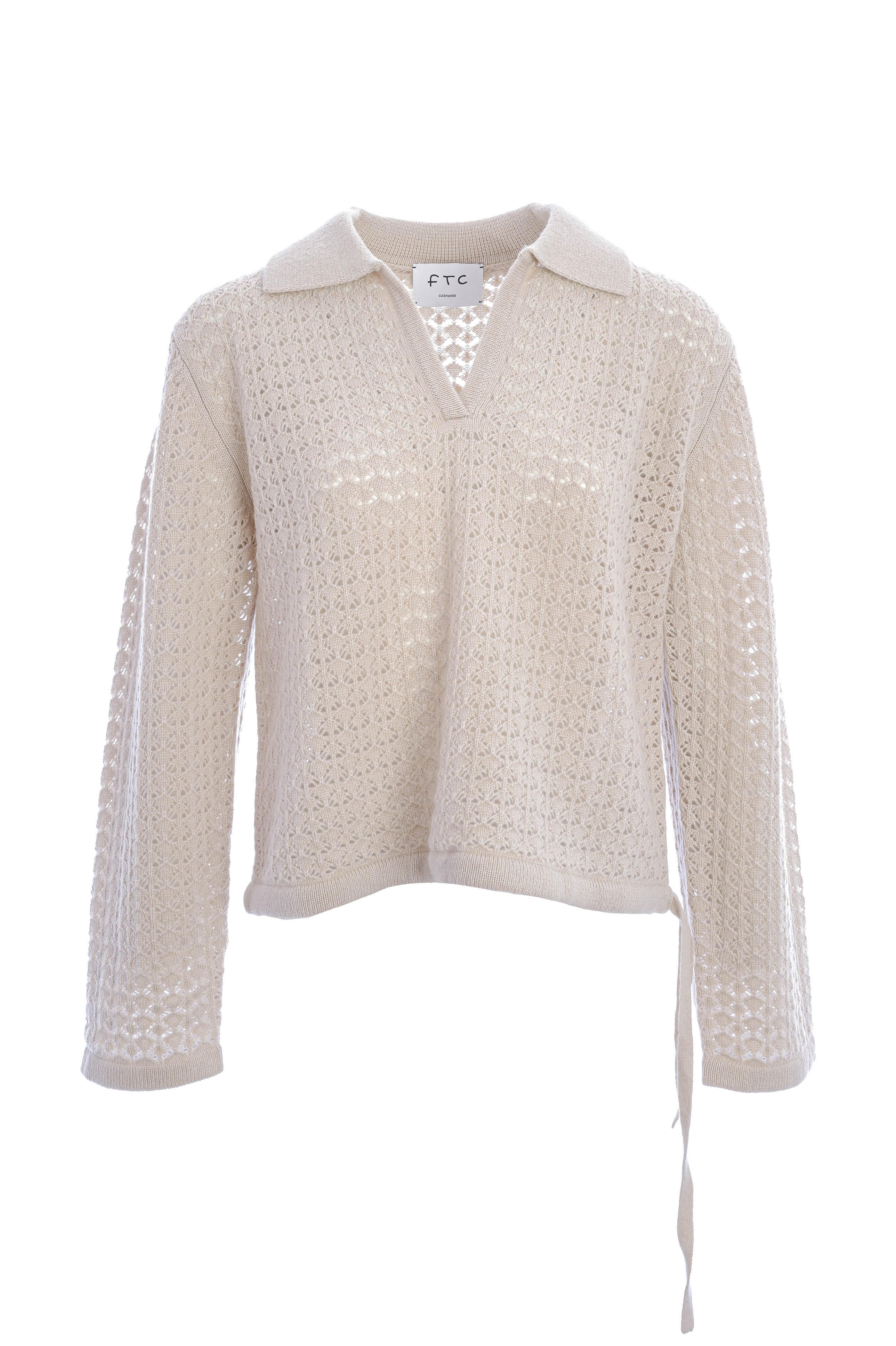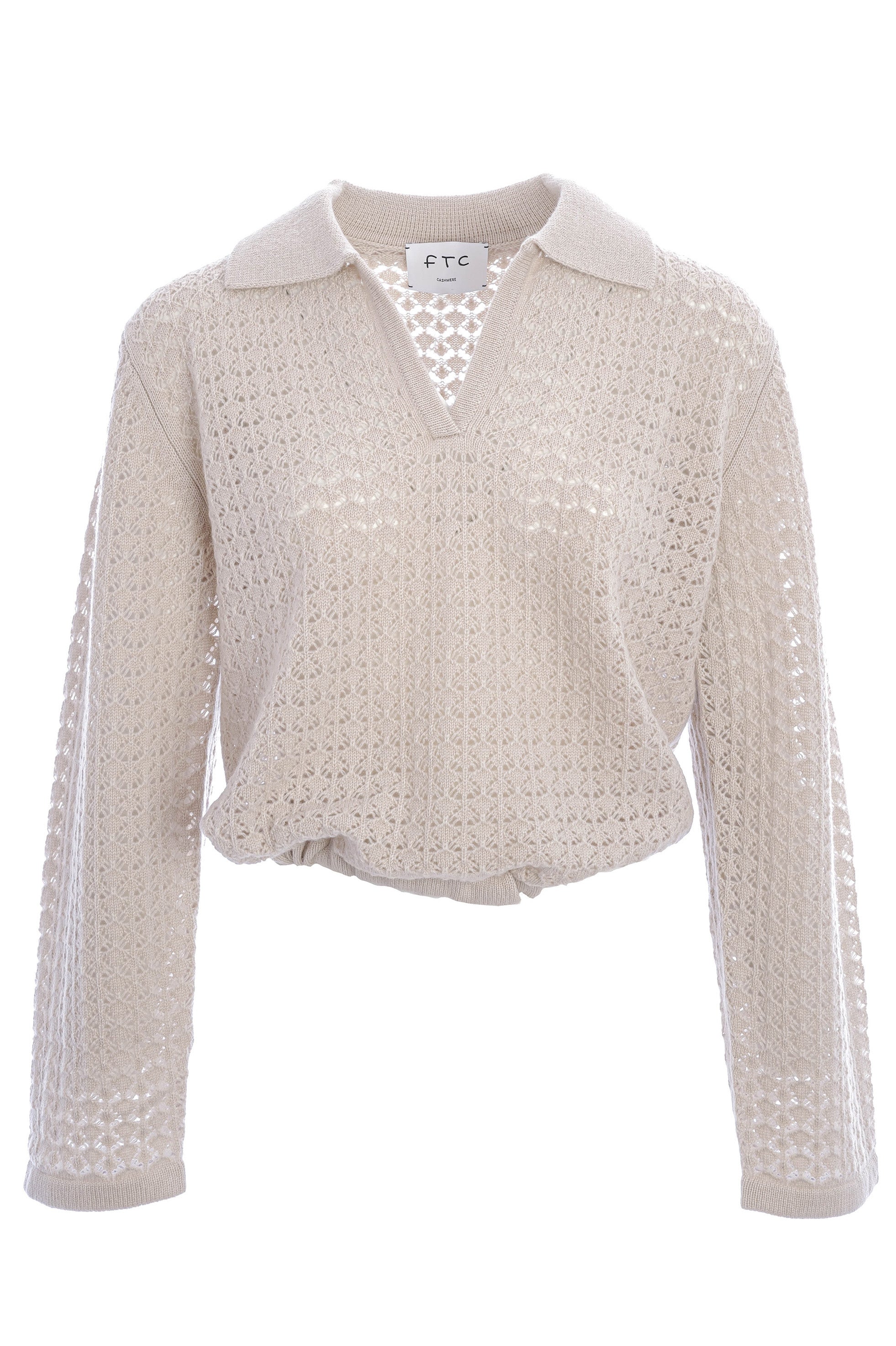 Dieser Ajourstrick-Pullover besticht durch filigranes Lochmuster und ein grafisches Design für elegante Damen-Looks. Polokragen mit tiefem Ausschnitt und lange Ärmel mit schlichtem Abschluss verleihen sportlich-elegante Akzente. Der elastische Saum mit Kordelzug sorgt für Flexibilität und eine moderne, schmeichelnde Passform.