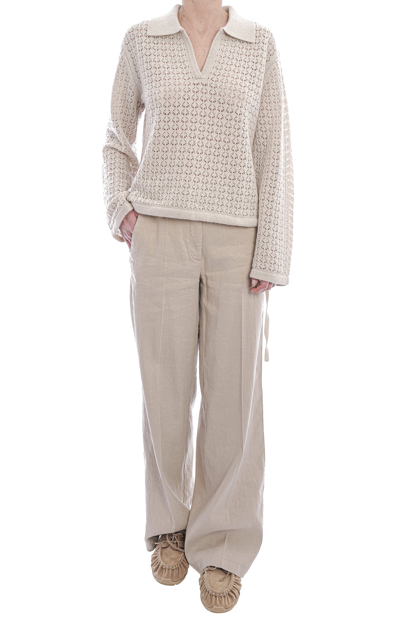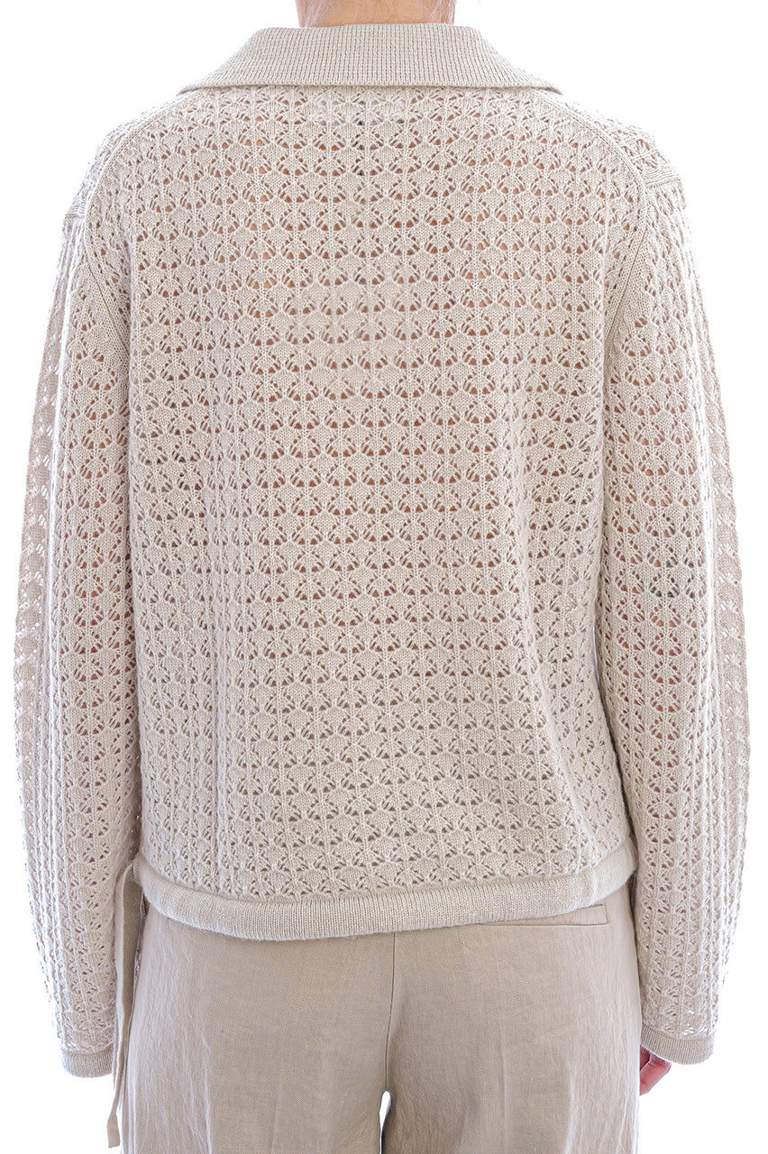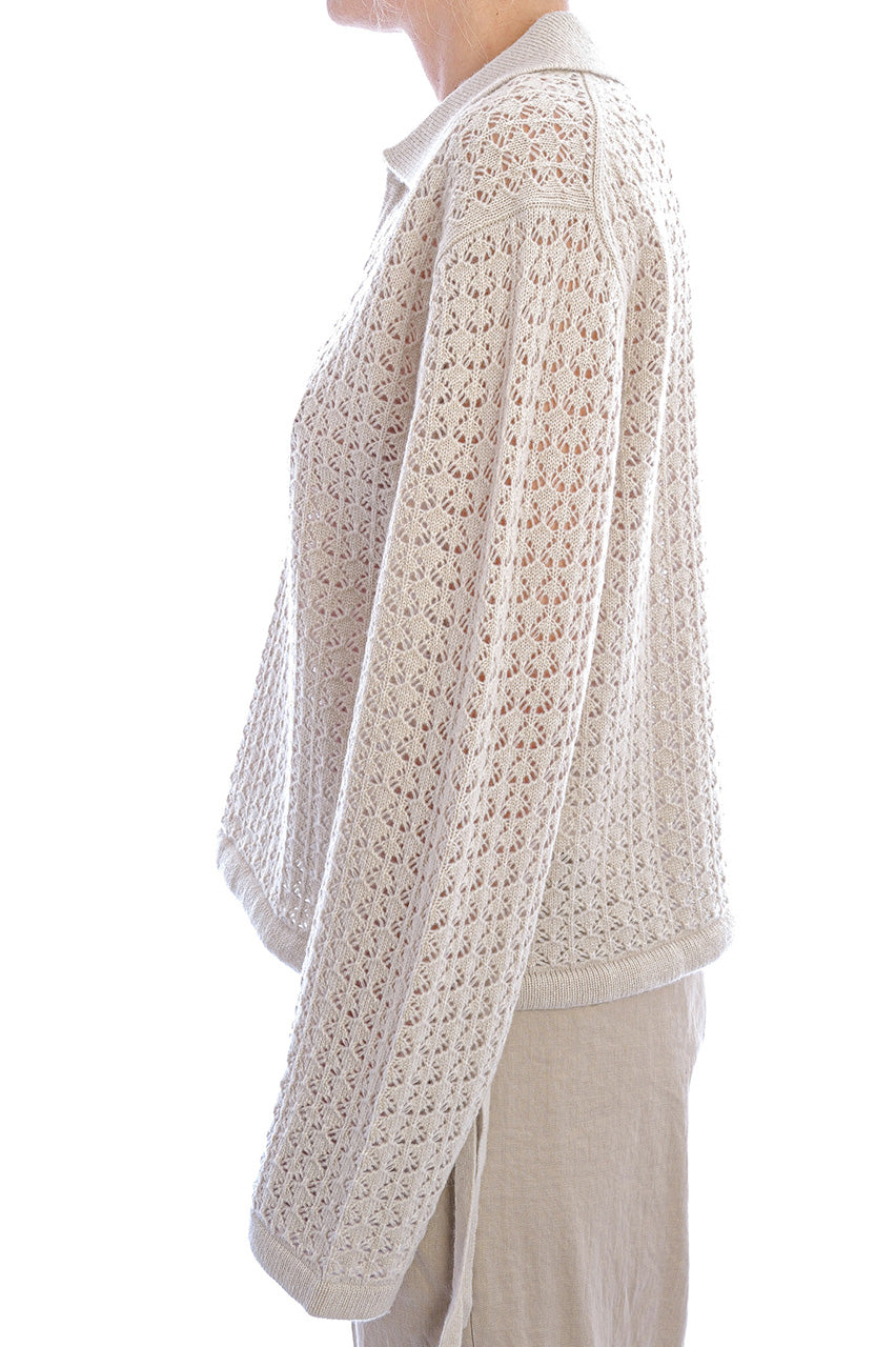 Dieser Ajourstrick-Pullover besticht durch filigranes Lochmuster und ein grafisches Design für elegante Damen-Looks. Polokragen mit tiefem Ausschnitt und lange Ärmel mit schlichtem Abschluss verleihen sportlich-elegante Akzente. Der elastische Saum mit Kordelzug sorgt für Flexibilität und eine moderne, schmeichelnde Passform.