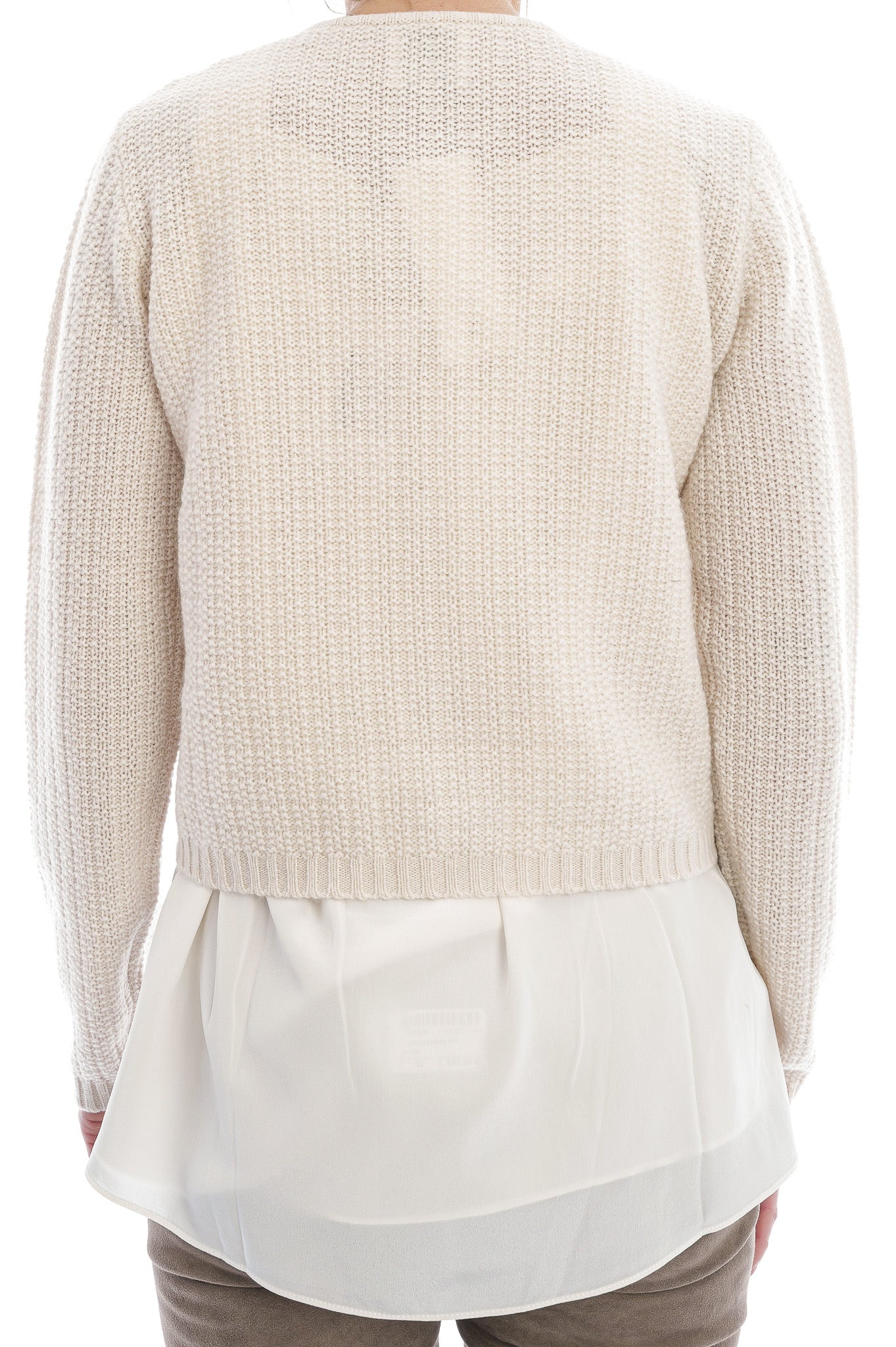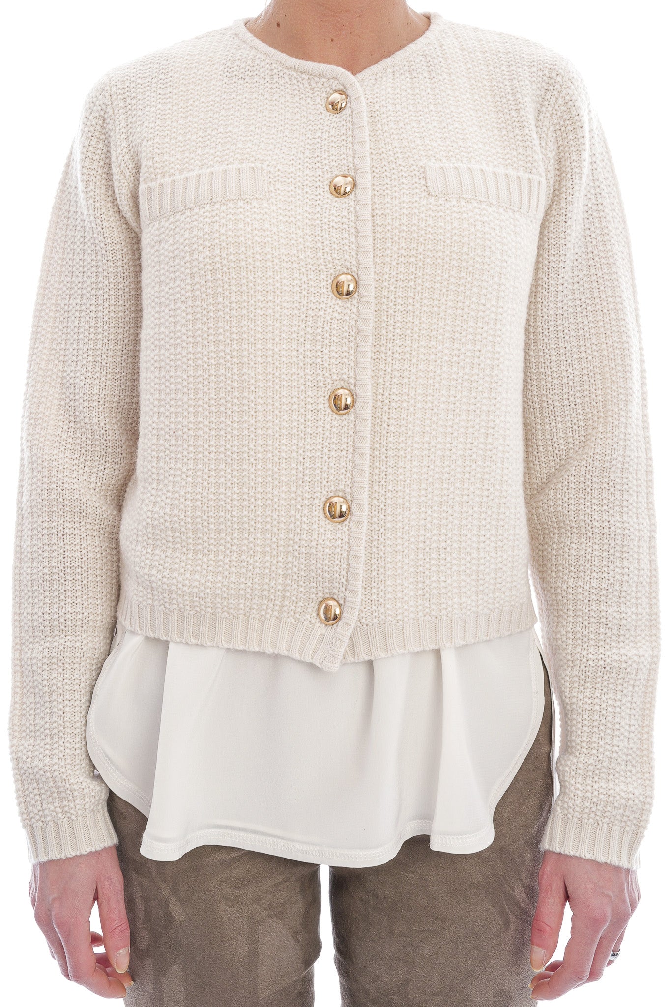 Die Strickjacke ist aus einem feinen, gleichmäßig strukturierten Waffel- oder Körbchenstrickmuster gearbeitet, das der Oberfläche eine leicht strukturierte, aber dezente Optik verleiht. Sie hat einen runden Ausschnitt, lange Ärmel, zwei Brusttaschen und eine durchgehende Knopfleiste mit glänzenden goldfarbenen Knöpfen, die einen eleganten Akzent setzen.