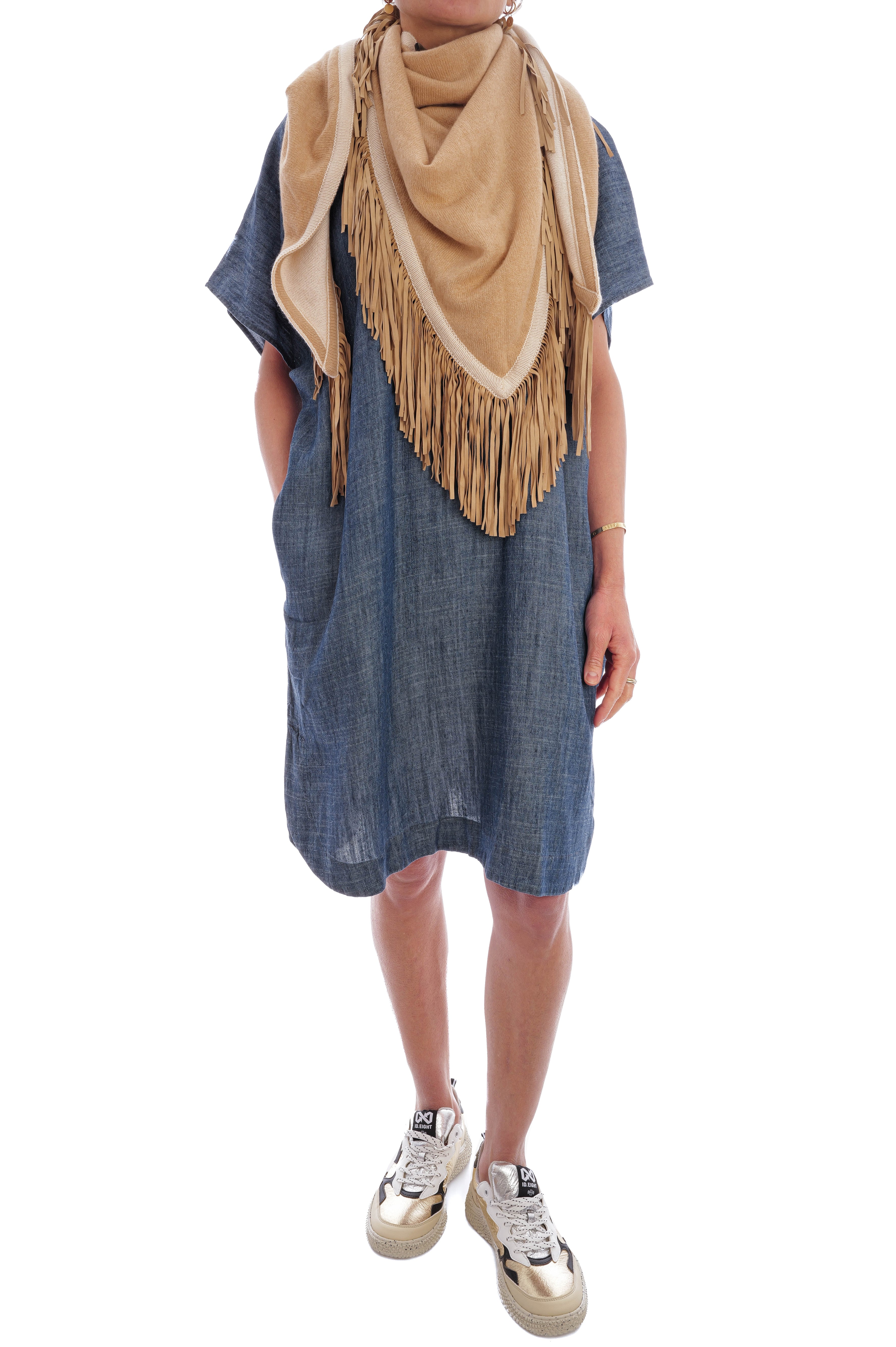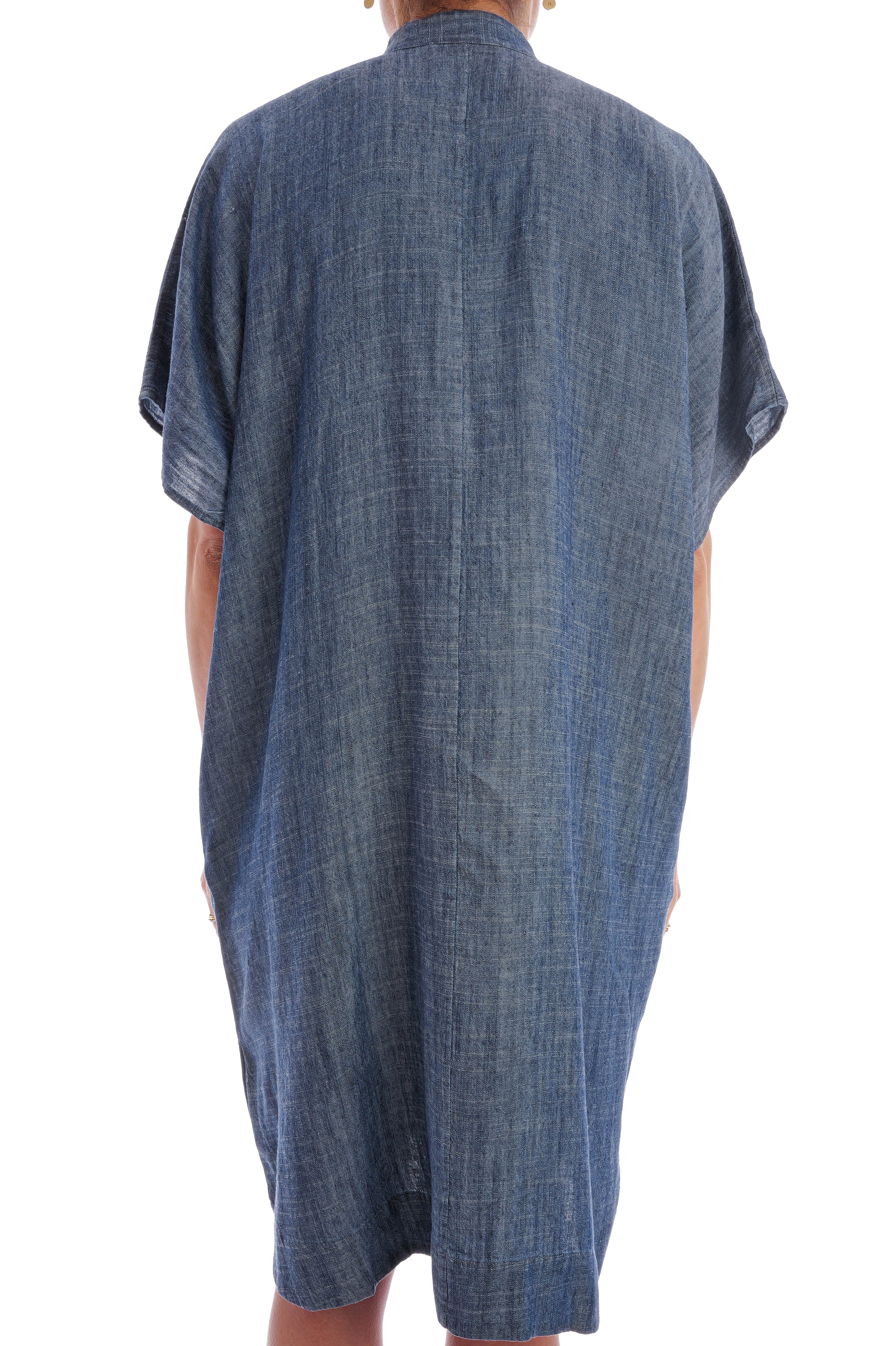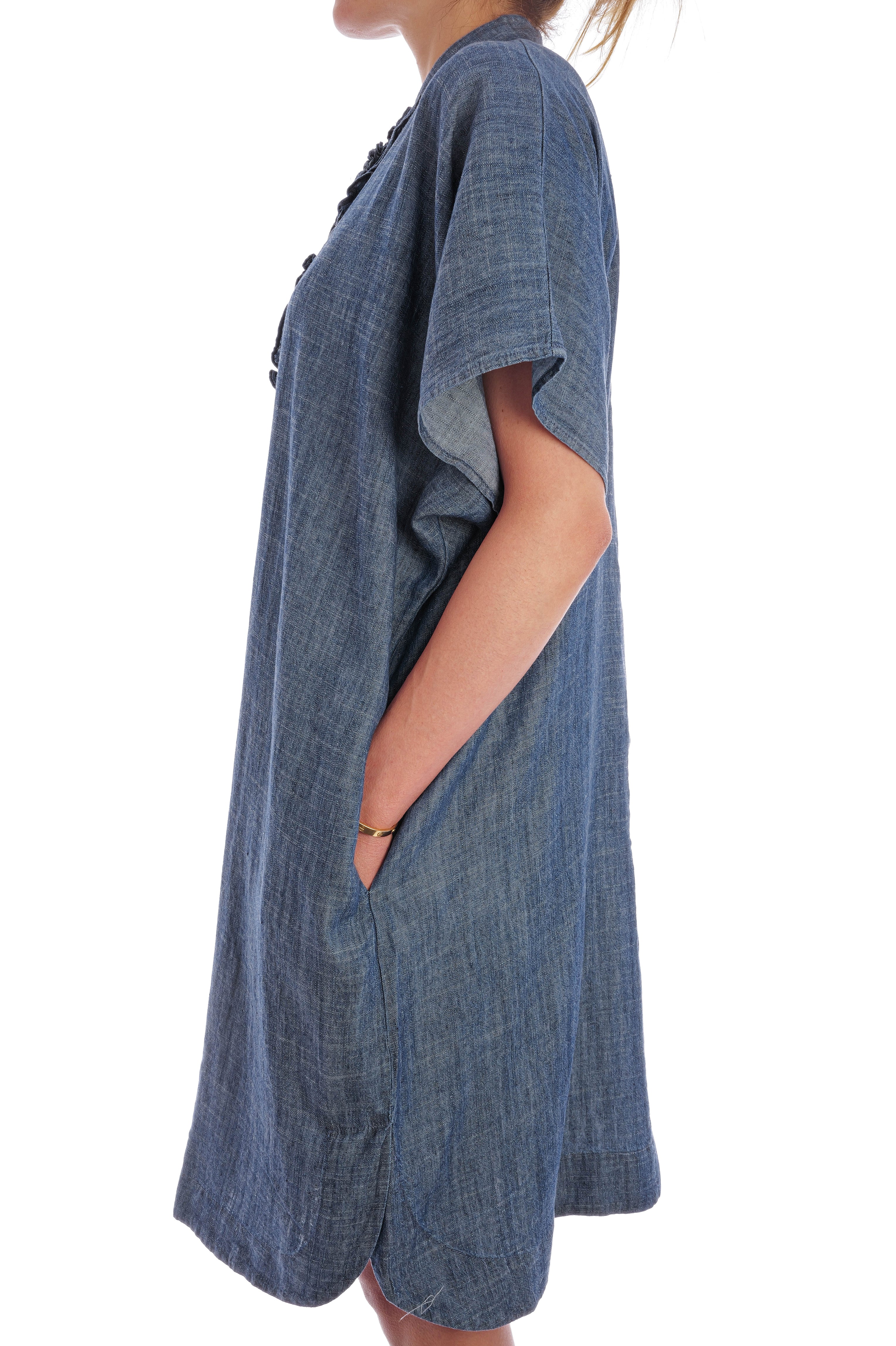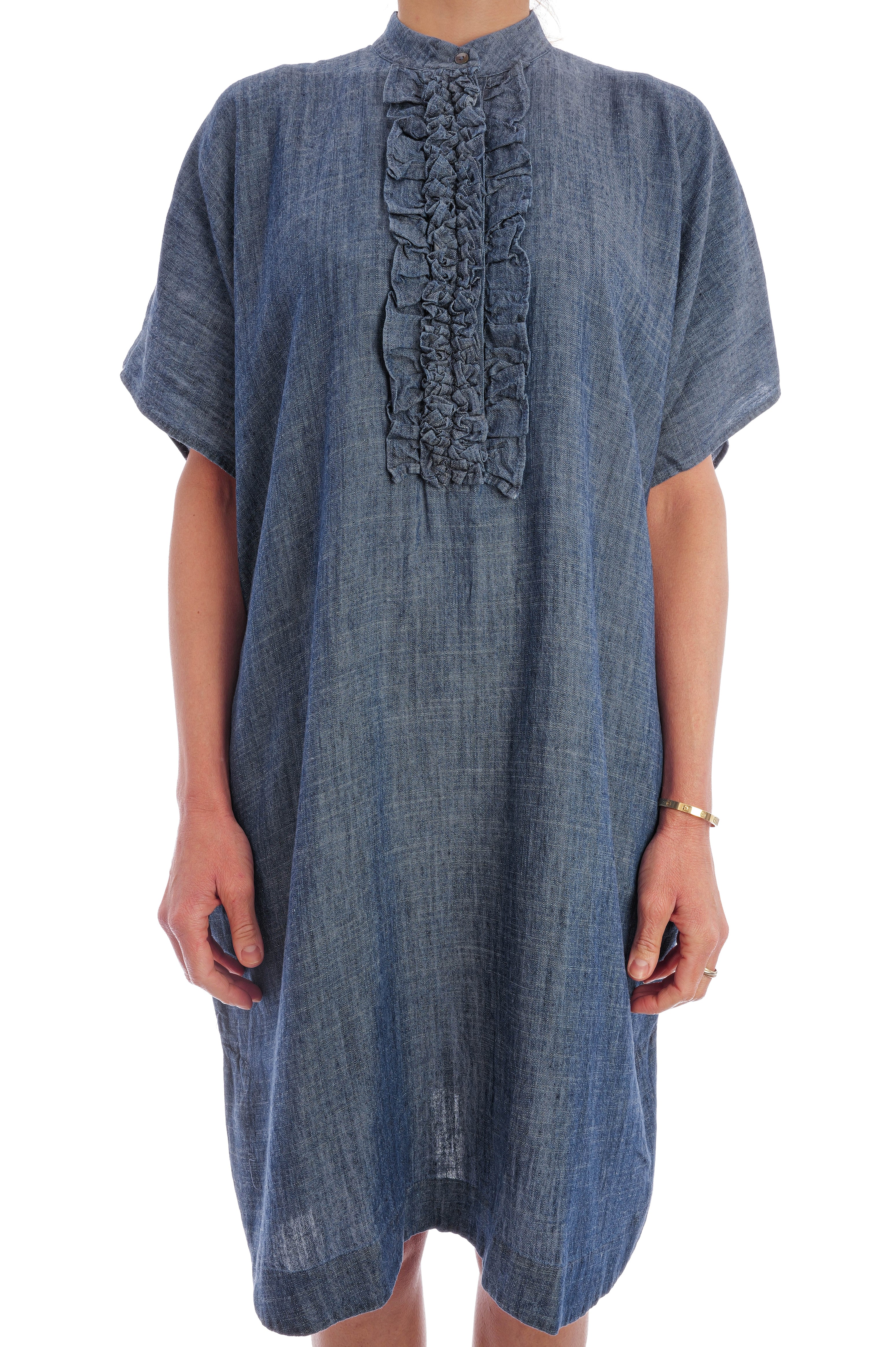 Das Daisy Dress besticht durch seinen geraden, lässigen Schnitt und kurze, locker fallende Schultern, die für ein angenehmes Tragegefühl sorgen. Der Denim Look wird durch ein zartes Rüschendetail an der Vorderseite feminin akzentuiert und verleiht dem Kleid eine subtile Eleganz. Der abgerundete Saum unterstreicht die sanfte Silhouette und macht das Daisy Dress zur idealen Wahl für einen entspannten, stilvollen Auftritt.