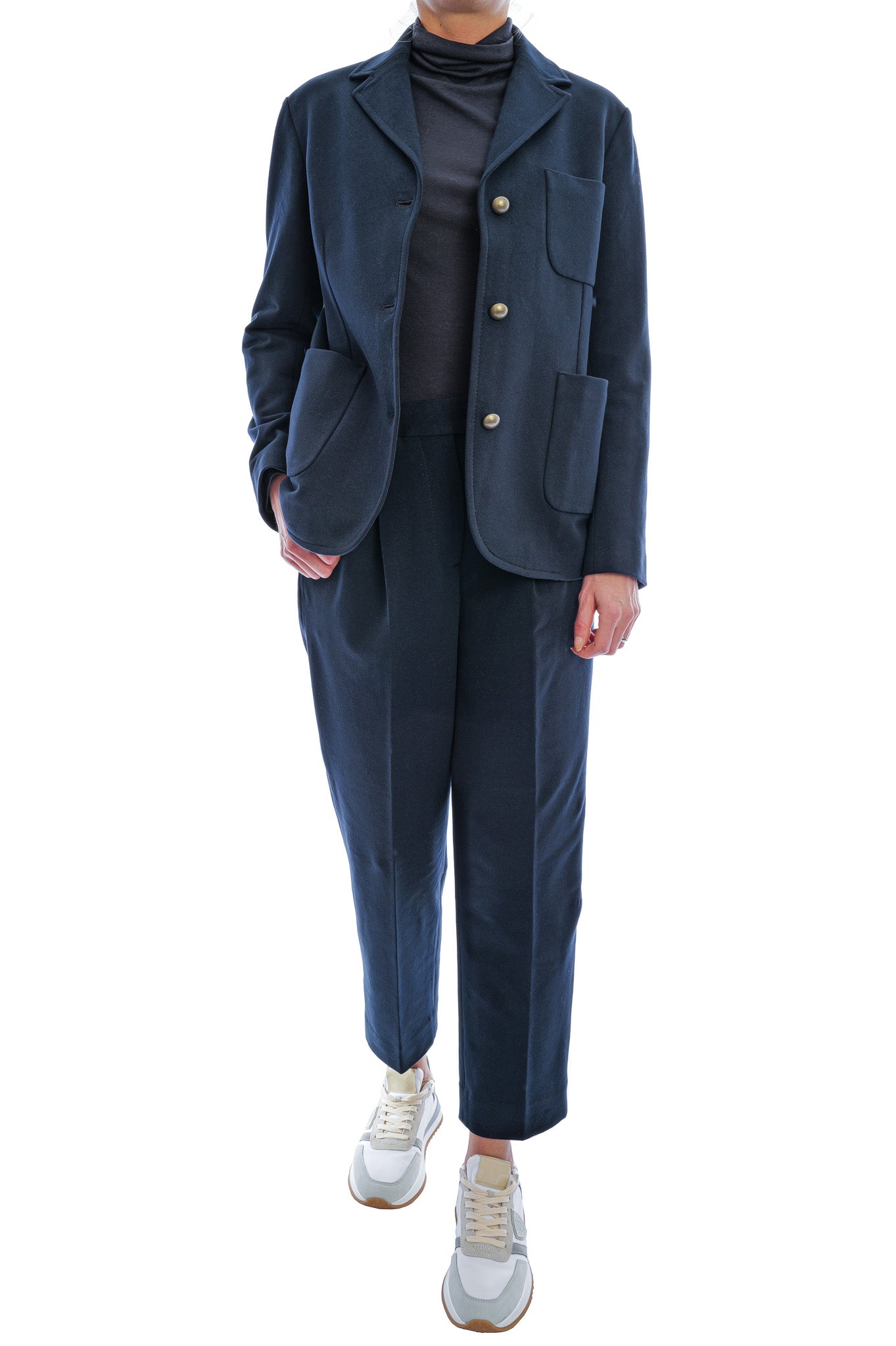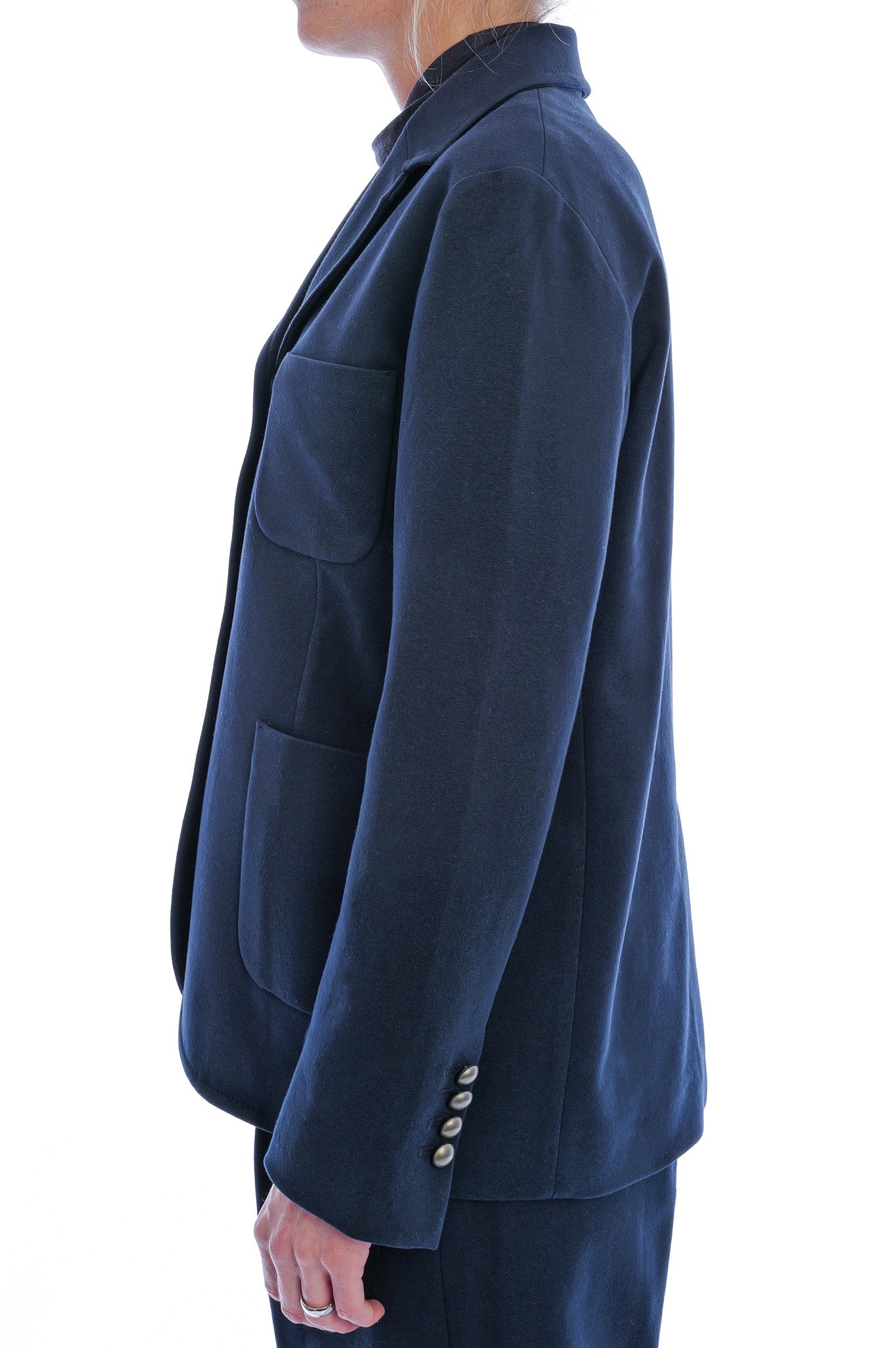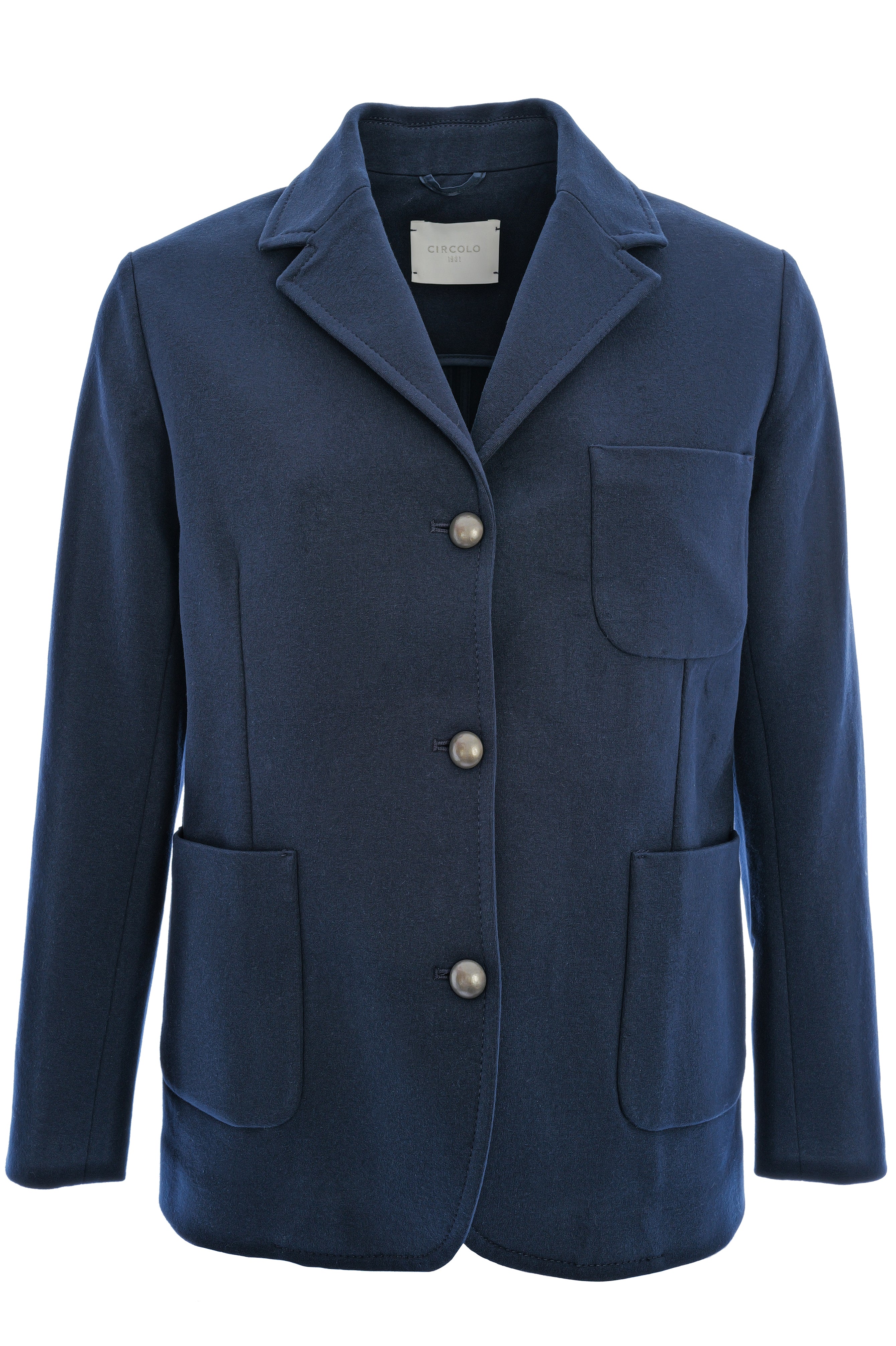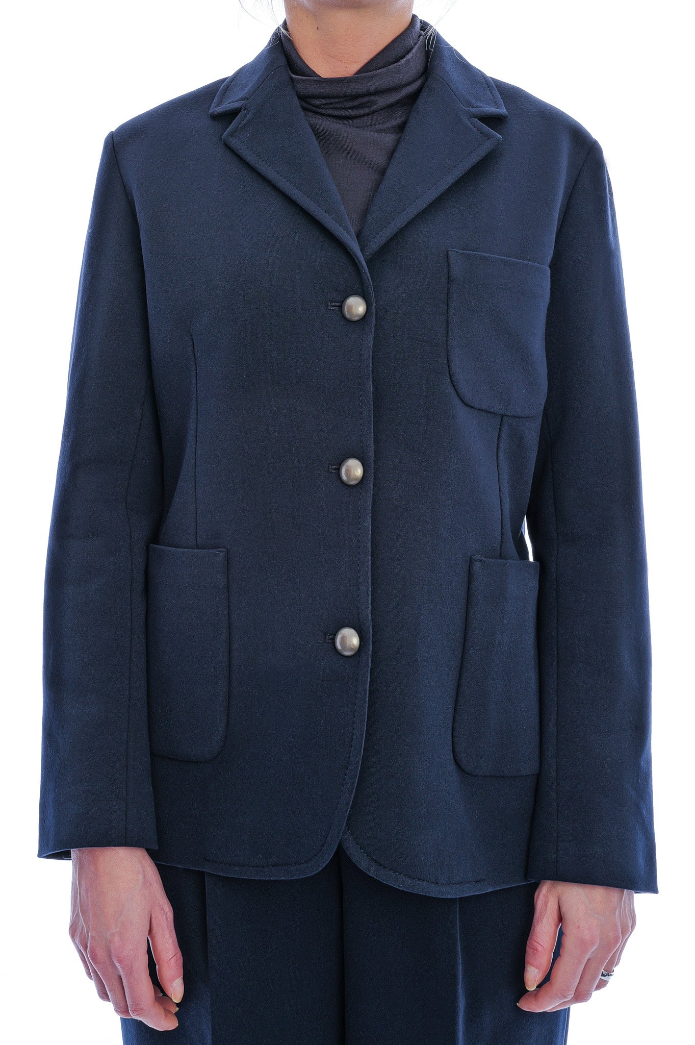 Eleganter Damenblazer mit klassischem Revers, aufgesetzten Taschen und feiner Brusttasche, abgerundet durch edle Halbkugelknöpfe – zeitlos chic und vielseitig tragbar.