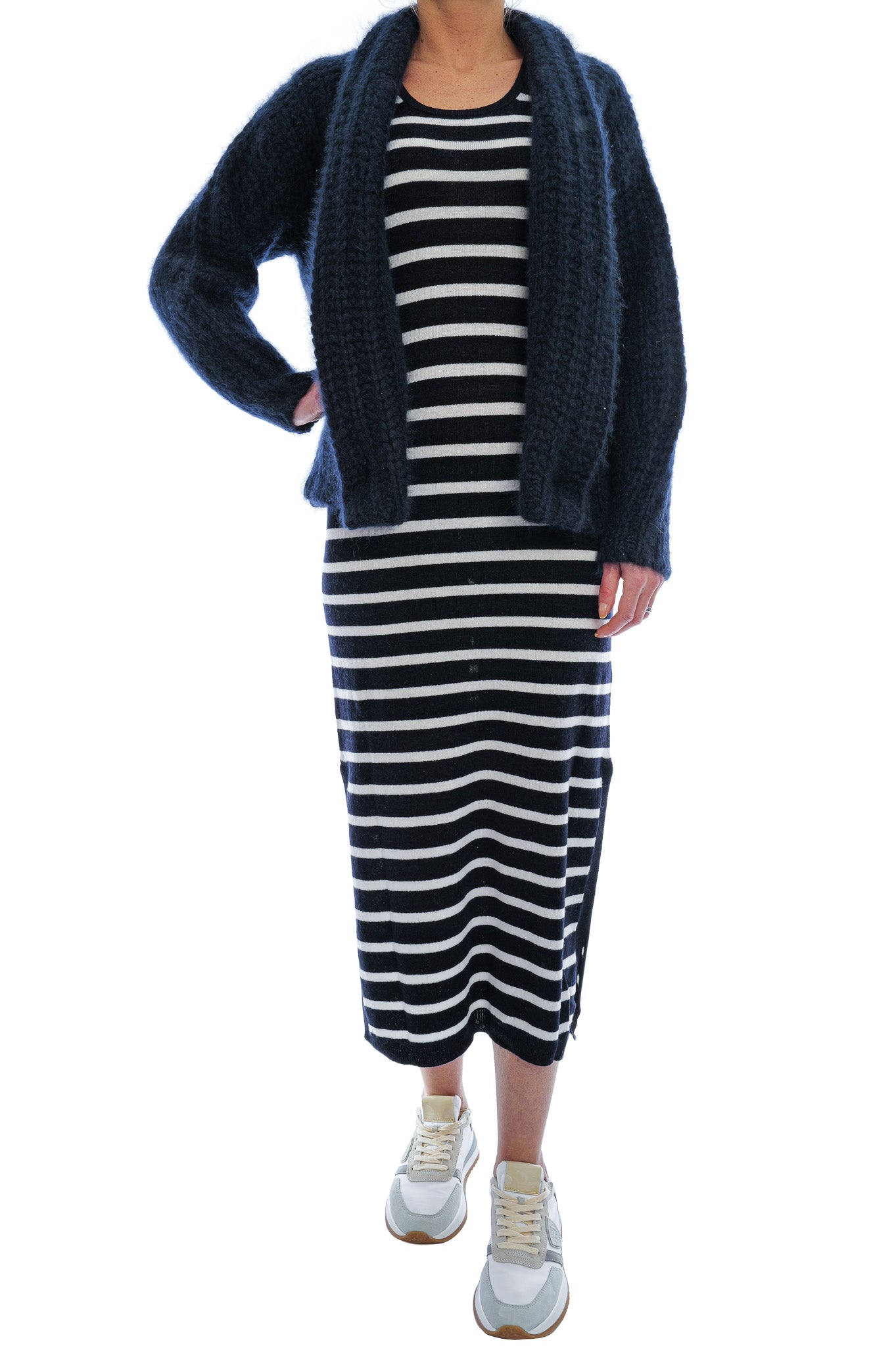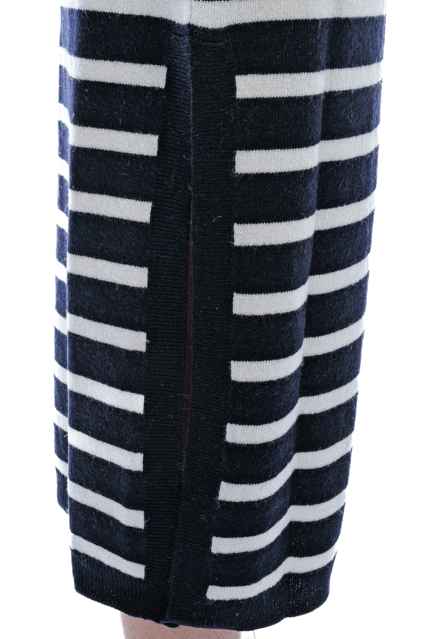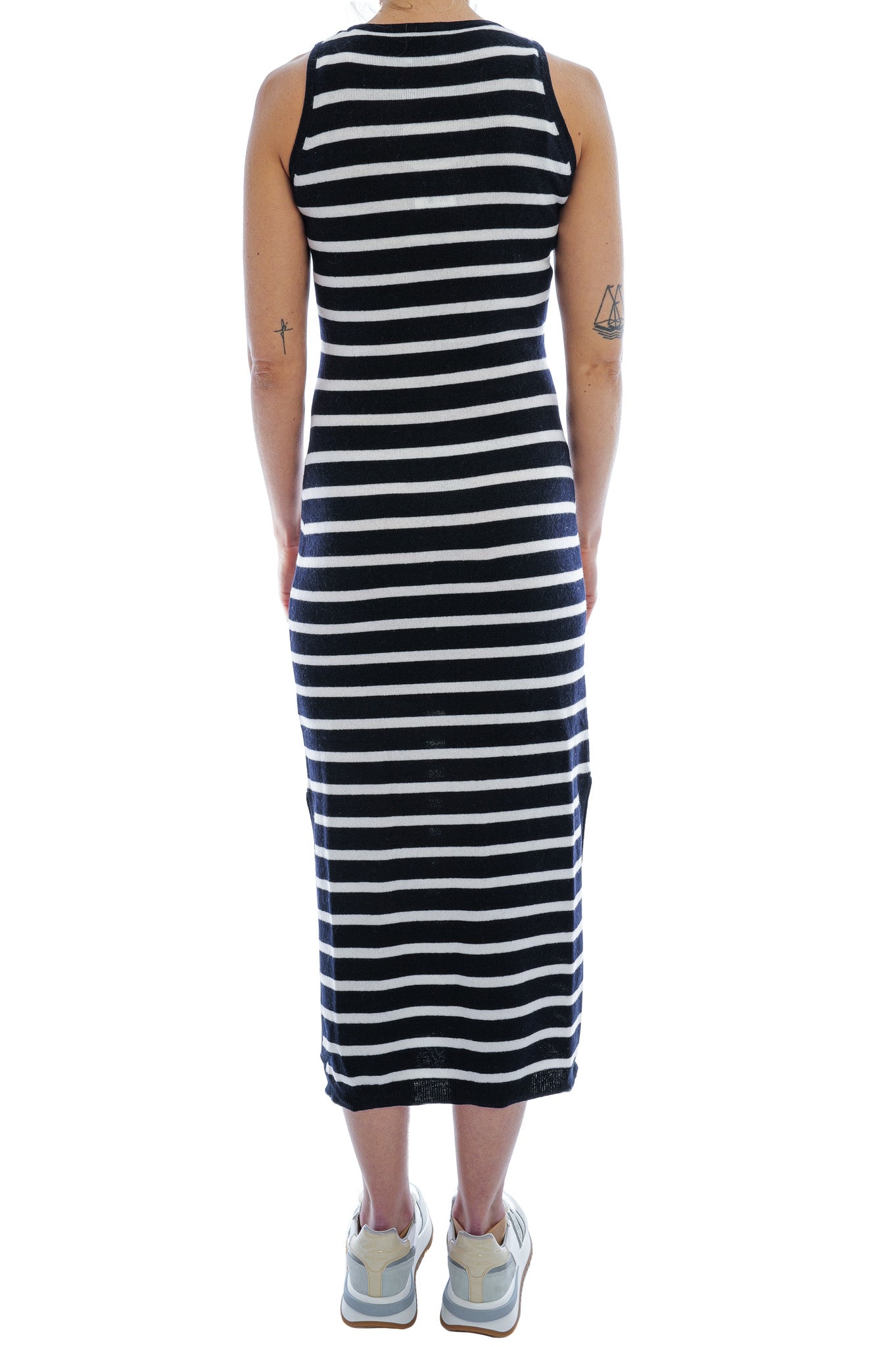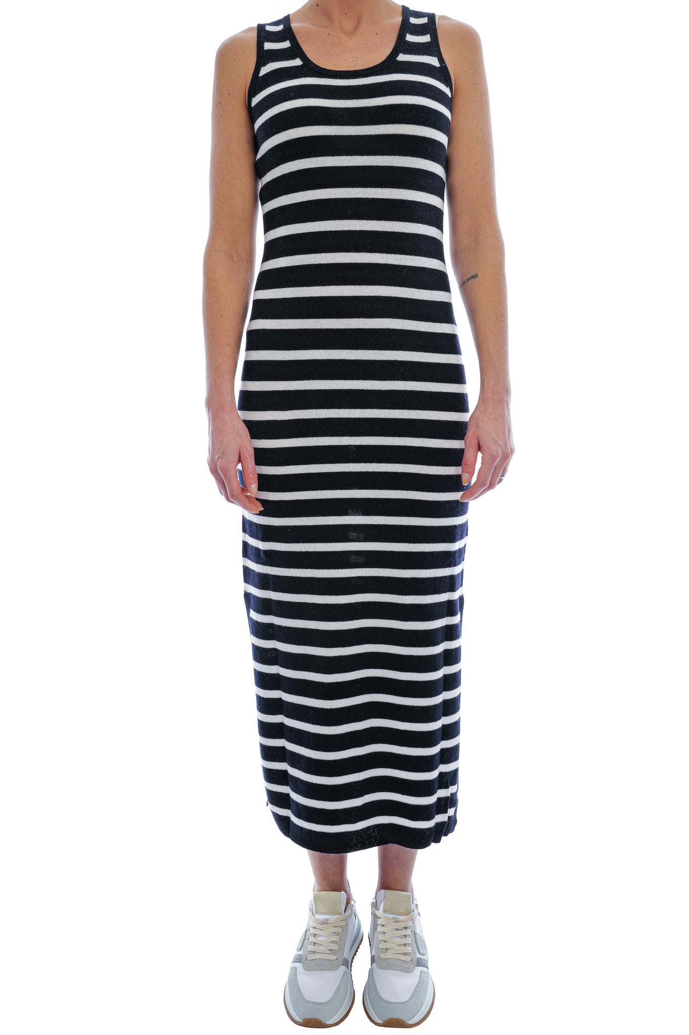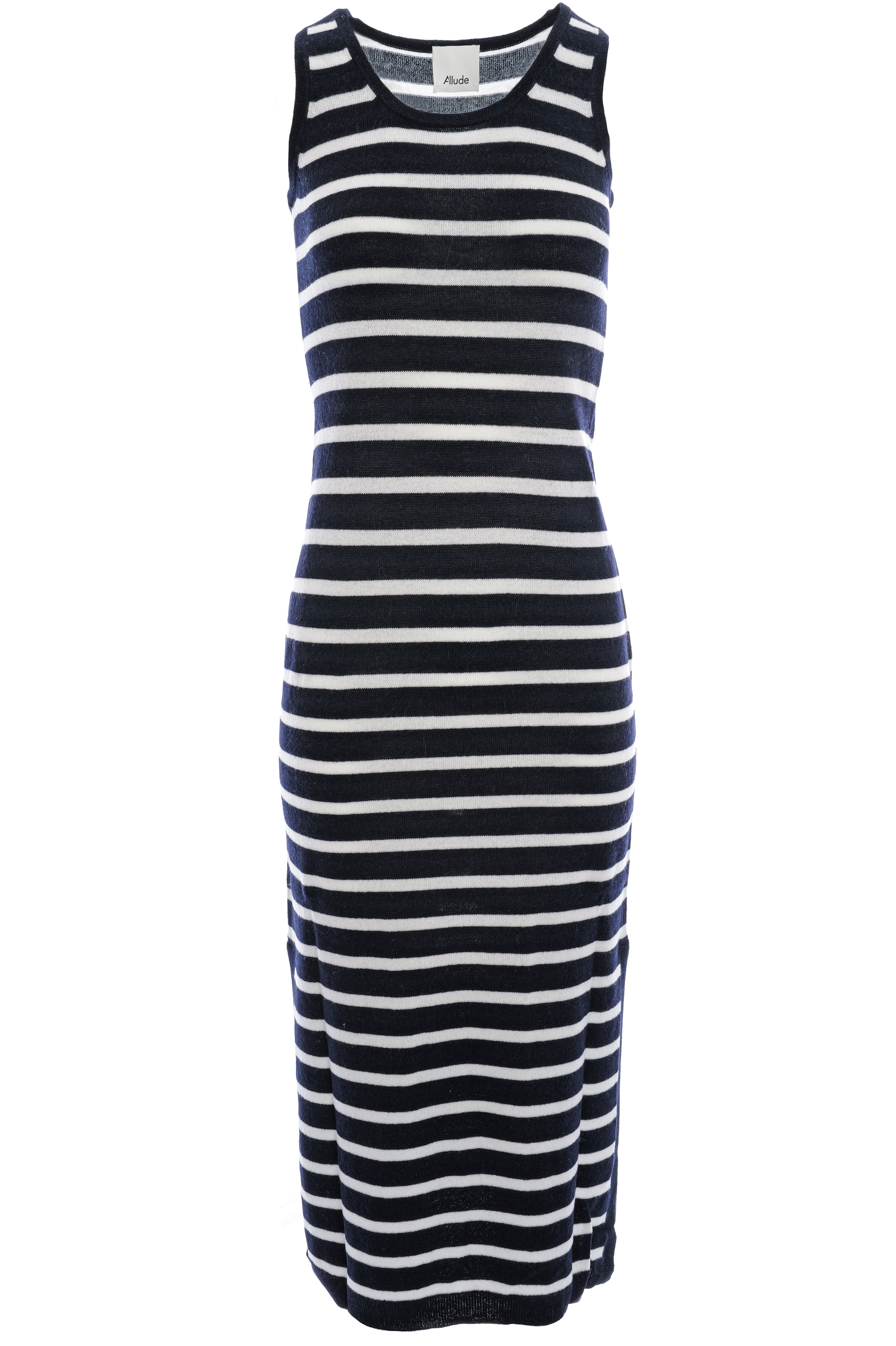 Ärmelloses Strickkleid aus Schurwolle und Kaschmir mit feinen Streifen und einem dezenten Beinschlitz links – schlicht, elegant und komfortabel.